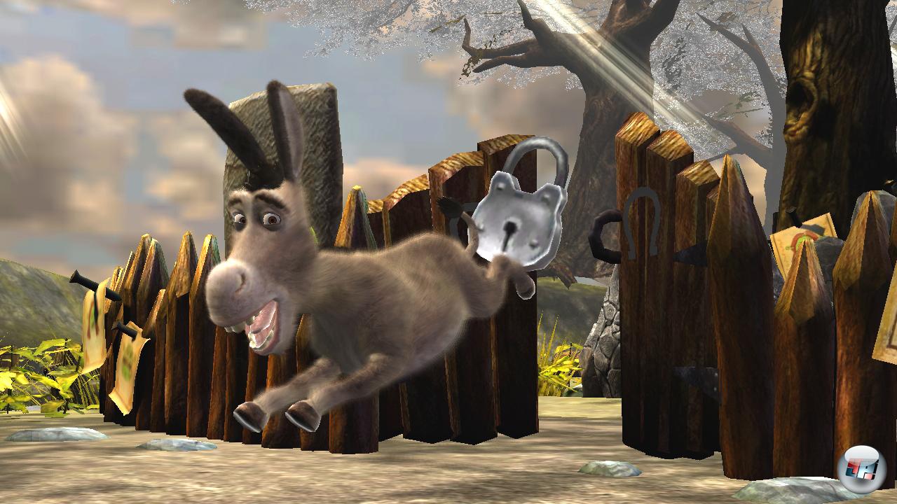 Von alldem bekommt man im Spiel nichts mit, denn die Entwickler haben die Geschichte des Films ziemlich frei ausgelegt. Zwar gibt es Story-Zwischensequenzen, doch die können (und sollten) aus zwei Gründen geflissentlich ignoriert werden: Erstens sind die Renderfilme, in denen Rumpel mit seinen Shrek- und Fiona-Puppen spielt, sehr nichtssagend und sehr hässlich. Aber immerhin nicht so komplett abstoßend wie die Echtzeit-Cutscenes, in denen teilweise Szenen des Films nachgestellt werden. Glaubt mir: Sie sind scheußlich. Wirklich, wirklich scheußlich! Vergessen wir also einfach mal die Story.
