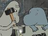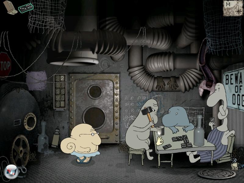 Diesmal kommen mir die Eier aber sehr gelegen: Ich kann sie in einem der geschickt in die Rätsel eingebundenen Minispiele benutzen. Das Känguruhwesen fängt nämlich liebend gerne Kugeln mit seinem Beutel und lässt sich so vor einem versperrten Eingang weglocken. Leider geben die Entwickler nur wenige Rätsel-Hinweise. Es ist also viel Trial & Error nötig, bis man die mitunter abstrusen Zusammenhänge des Spiels entschlüsselt hat. Happig wird es auch dadurch, dass viele Objekte nach dem Benutzen nicht einfach verschwinden, sondern in einem anderen Teil des wachsenden Labyrinths wieder und wieder benutzt und mehrmals hin- und hergetauscht werden müssen. Immerhin beruhigt der locker-flockige Jazz-Soundtrack die Nerven. Die kurzen Musik-Loops wiederholen sich allerdings schnell und sind recht holprig miteinander verbunden. Wer keinen Wert auf Verpackung und Poster legt, kann sich Full Pipe übrigens auch für nur 4,99 Euro auf Steam herunterladen, Daedalics Retail-Fassung kostet dagegen 19,99 Euro.