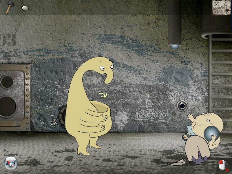 Der sympathische Protagonist lässt sich mit klasssicher Point&Klick-Steuerung durch die Räume navigieren. Je nach Einsatzort verwandelt sich der Mauszeiger: Ein Fuß zeigt z.B. an, dass Dude zum Ziel laufen kann – theoretisch jedenfalls. Praktisch trippelt er nur zu einigen der anklickbaren Positionen. Finde ich ein Stück poröse Wand und will sie mit dem Hammer aus dem Inventar bearbeiten, reagiert die Steuerung ebenfalls ein wenig ungenau. Oft muss ich mittig auf das Objekt zielen, was mangels Hotspot-Anzeige zu nervigem Pixelhunting führen kann. Verwandelt sich der Cursor-Fuß in eines von drei Hand-Symbolen, lässt sich der Gegenstand aufnehmen oder mit anderen Dingen benutzen; durch Röhren klettern und von Leitern hüpfen kann der kleine Dude ebenfalls.