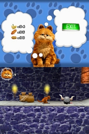 Ein Kater in London Als blinder Passagier in Jons Handgepäck findet sich Garfield in der britischen Hauptstadt wieder, wo er sich mit einem blaublütigen Kater anfreundet, der ihn auf eine königliche Lasagne einlädt – da wird nicht lang überlegt! Zwischen diesem Gedanken und dem Festmahl liegen 22 kurze Levels voller Hindernisse, Gegner, Busfahrten und Jump-n-Run-Einlagen, die aber schneller vorbei sind, als ein Montag in Garfields Leben: Ihr trabt und springt u.a. durch die Londoner Innenstadt, einen Wald, diverse Höhlen oder durch das hohle Innere eines gigantischen Baumes. Ihr beginnt jedes Level natürlich mit neun Leben, allerdings gibt es viele Möglichkeiten, die zu verlieren: Werdet ihr vom Auto erwischt, vom Lüfterstrahl getroffen, von einem Fledermausschwarm touchiert oder fallt ihr ins Wasser, rückt das Game Over einen Schritt näher. Technischer Katzenjammer Die Technik erinnert an den Klassiker Pandemonium: 3D-Levels, die ihr auf 2D-Pfaden durchquert. Das Leveldesign ist dabei völlig linear, nur selten habt ihr die Möglichkeit, euch zwischen zwei Richtungen zu entscheiden. Die Kulisse wirkt eher abschreckend: die Grafik ruckelt immer wieder, die Texturen flimmern, die Ladezeiten sind für ein Modul verhältnismäßig lang, das Gesamtbild sehr simpel – und Garfield selbst einfach nur ein oranger Haufen, der aber ganz nett animiert ist. An speziellen Punkten dürft ihr in die Garfield-o-Vision schalten, woraufhin ihr still sitzend die Umgebung via Touchpadsteuerung durch Katzenaugen erkunden dürft – witzige Idee, aber im Grunde sehr nutzlos. Während ihr die einfachen Geschicklichkeitstests bewältigt, tüdelt euch sehr schrille Midi-Musik entgegen, die aus kurzen, sich dauernd wiederholenden Loops besteht und schon nach kurzer Zeit gehörig nervt. |  | Fakten: – 22 Levels – automatisches Speichersystem – Levels orientieren sich am Film – Mikrofon- und Touchpad-Nutzung – 3D-Levels, 2D-Pfade – elf Sprachen – lineares Leveldesign – unten Spielgrafik, oben Statistiken Pro / Kontra: + einfache Steuerung + einige nett designte Levels + simples Spielprinzip – nervende Soundkulisse – ruckelige, flimmerfreudige, grobe Grafik – recht lange Ladezeiten  | | Unten steuert ihr Garfield durch die 3D-Levels, oben werden ein paar Statistiken angezeigt. |