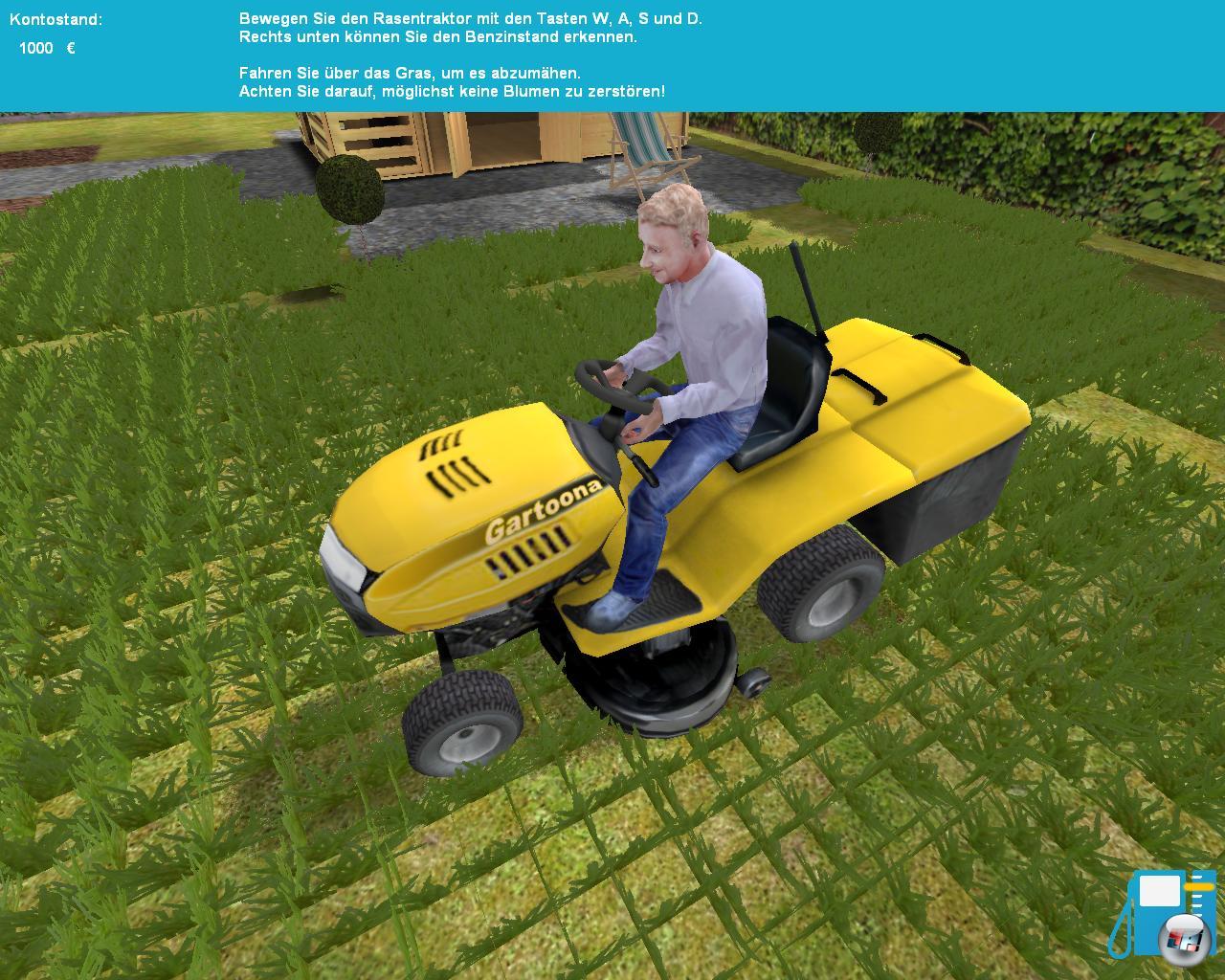 Aber es gibt ja noch den Rasenmäher! Eine Standardausführung und ein Rasentraktor stehen zur Auswahl. Doch auch hier unterscheidet sich die Bedienung kaum voneinander: Ob der Mäher gefahren oder geschoben wird, macht keinen Unterschied, lediglich der Wirkungskreis ist ein anderer. Immerhin darf ich im freien Spiel und in einigen Missionen meinen Garten auch mit Gartenzwergen, Zierkies, Brunnen, einem Pavillon, Tisch und Stühlen aufwerten.