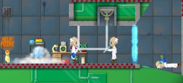 So ein Pech! Da reißen die Äffchen in Eds Labor glatt die Macht an sich und sperren den Wissenschaftler in eine Zelle. Eine große Zelle allerdings, denn sie verriegeln lediglich die Türen seines eigenen Labors. Und so weitläufig das auch ist: Ed will da raus! Also schnappt [GUI_PLAYER(ID=90477,width=377,text=Vergrößern, Verkleinern und die Zeit verschieben: So funktionieren die Gateway Guns.)] er sich sein Pendant zu Valves Portalwaffe, die Gateway Gun, und schießt ein Loch in die Wand. Schießt er in großer Höhe noch ein zweites Loch in die Decke, spaziert er durch die Risse, als wären sie eine gewöhnliche Tür.