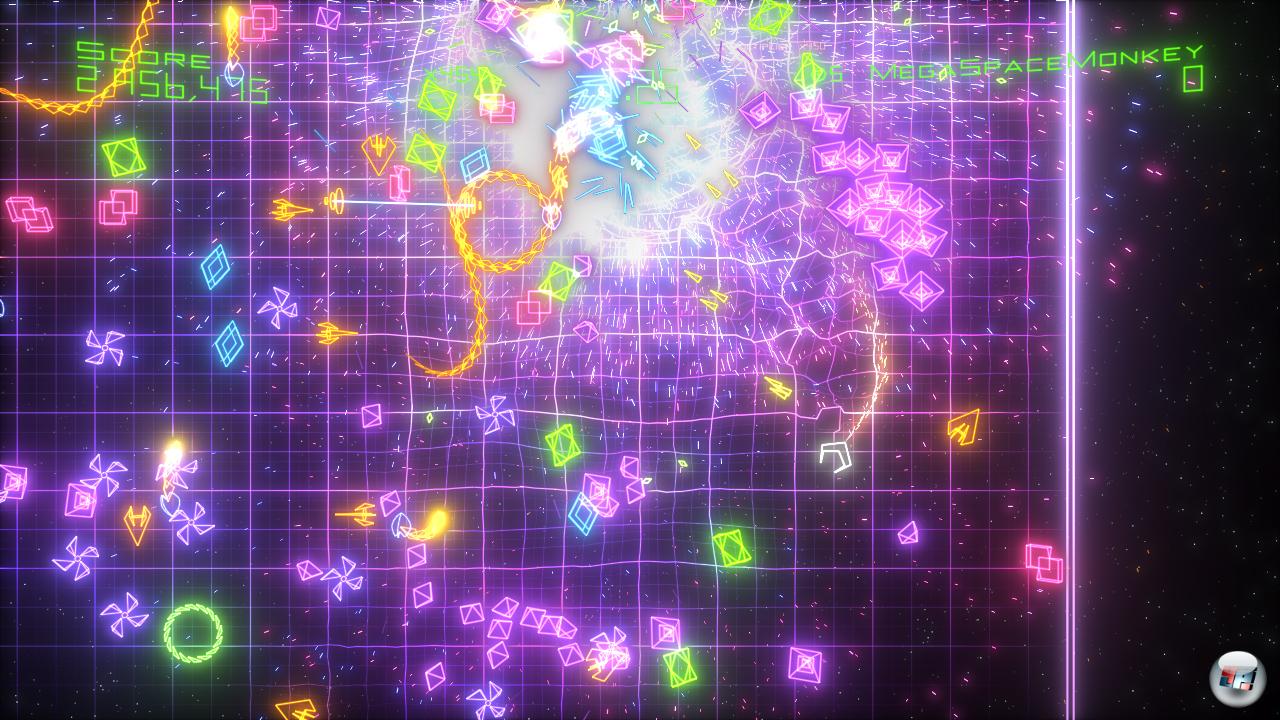 Da soll noch mal einer sagen, man würde beim Videospielen nichts lernen. Geometrie und Algebra zum Beispiel, also Mathe. Grundsätzlich sind ja schon mal sämtliche geometrischen Formen gefährlich. Hätt’s einer gewusst? Eben! Und wer wäre darauf gekommen, dass Vierecke wie übereifrige Magneten auf einen zufliegen? Oder dass grüne Quadrate schneller sind als blaue, aber weniger gefährlich als violette? Und was machen Kreise, die vom Laser getroffen werden? Genau: Die saugen alle Formen in ihrem Umfeld auf, bis sie irgendwann explodieren. Ist