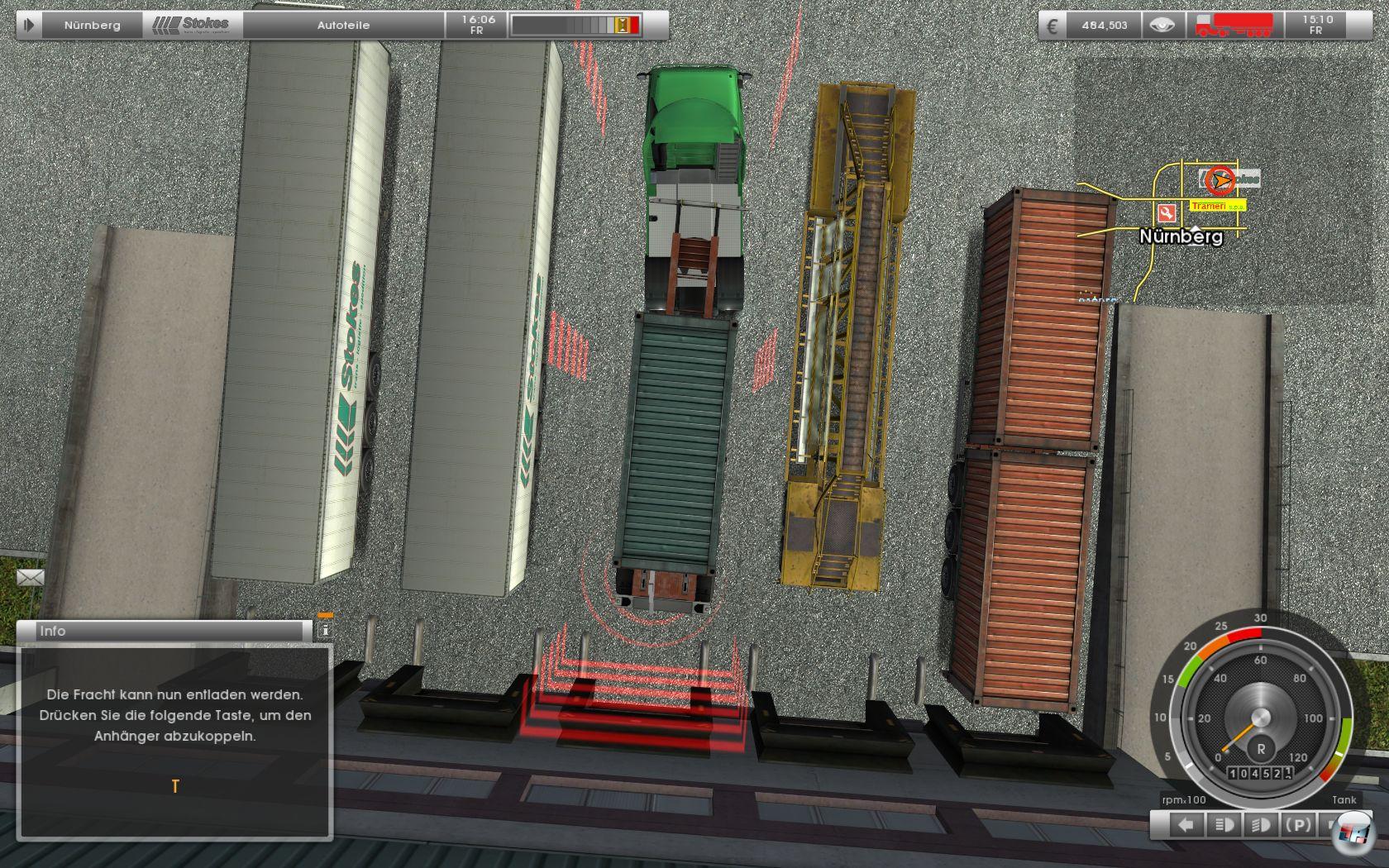 Es gilt innerhalb von acht Stunden Käse von Hamburg nach Dresden zu transportieren. Also erstmal meine Zugmaschine auf dem Hof meines Spediteurs an einen per Pfeil markierten Sattelauflieger manövrieren. Sieben Kameraperspektiven stehen mir zur Verfügung, das Tutorial schlägt mir für diese Aktion die Vogelperspektive vor, was eine gute Wahl ist. Angekoppelt wird der Anhänger per simplem Tastendruck. Nun geht’s per Fahrerperspektive ab auf die Straße.
