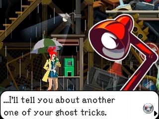 [GUI_PLAYER(ID=66269,width=350,text=Wie spielt sich Ghost Trick? Hier investigative Szenen aus dem Büro.)]Gleich zu Beginn trifft man als frisch Ermordeter auf eine seltsame Lampe, die einem Tricks beibringt, um vergangene Ereignisse zu verändern: Man kann nicht nur die Gedanken von Menschen lesen und mit Verstorbenen sprechen, sondern die Zeit vier Minuten vor den Todeszeitpunkt eines Opfers zurück spulen. Dann darf man als blau leuchtender Geist einige Gegenstände manipulieren. Warum nicht in einen Schalter fahren, um Licht zu machen? Oder in ein Fahrrad, um zu klingeln? All das könnte einen Täter irritieren…