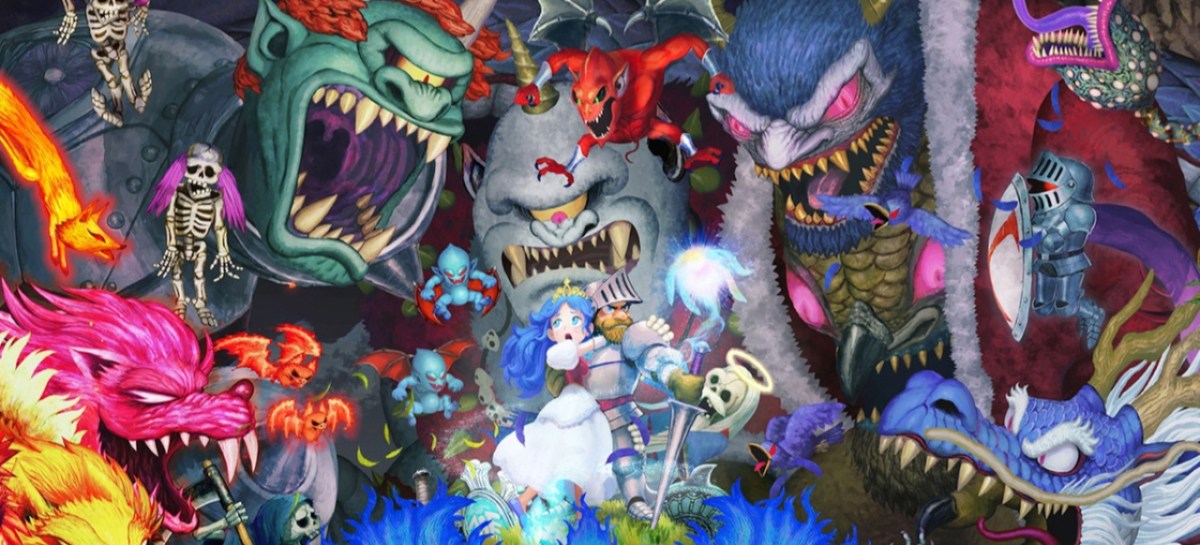 Das sieht ja fast aus wie in einem Märchenbuch, wenn sich die vergilbte Schriftrolle öffnet: Ein tapferer Ritter unter einem Baum, eine hübsche Prinzessin in Nöten und ein böser Dämonenkönig am Horizont. Mehr Oldschool geht ja kaum! In bunten Farben wird die Szene ausgemalt, so dass aus der Boxershorts mit den Herzen eine eiserne Rüstung wird. Alles sieht so harmlos aus, dass man fast ein nettes Spiel für Kinder vermutet. Aber wenn der idyllische Vorhang fällt, steigen die fiesen Monster in Scharen aus ihren Gräbern – und ihnen folgen alsbald bitterböse Flüche.