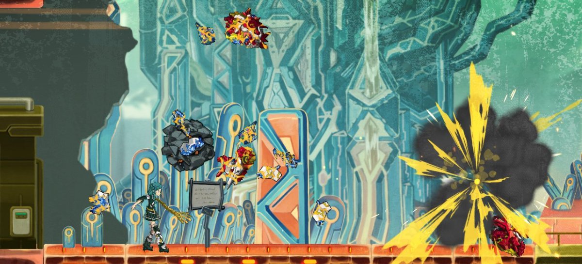 So kann Reika mit ihrem mechanischen Arm nicht nur kräftig in der Vertikalen sowie Horizontalen austeilen und damit bestimmte Wände zum Einsturz bringen oder natürlich Roboter in ihre Einzelteile zerlegen. Sie kann alle zerstörten, losen bzw. herumliegenden Elemente, die mit gelber Nano-Flüssigkeit markiert sind gleichzeitig aufnehmen und so quasi ihren Arm um eine dynamische Abrissbirne erweitern. Sie kann die Trümmer auch zu neuen Gegenständen zusammensetzen, wobei die Baupläne erst in den Computer-Terminals der in dutzende Einzelbereiche unterteilten 2D-Plattform-Spielwelt gefunden werden müssen. Mit einem Würfel z.B. kann man nicht nur „Wippen“ manipulieren, sondern kann ihn auch benutzen, um höher liegende Plattformen zu erreichen. Mit der „Peitsche“ lassen sich weitere Wände zerstören, die mit dem „einfachen“ Schlag keine Schramme nehmen usw. Die Vorbilder Metroid und Castlevania werden spätestens hier spürbar: Sehr häufig ist mit neuen Einsatzmöglichkeiten oder Upgrades im immer größer werdenden Fähigkeitenbaum der Zugriff auf neue oder vorher nicht betretbare bzw. erreichbare Areale verbunden. Sehr schön: Neben 20 frischen Puzzleräumen sowie einem weiteren Schwierigkeitsgrad gibt es in der „Alt.“-Version von Giga Wrecker im Vergleich zum PC einen Roboter-Sidekick, der einen nicht nur mit lobenden Worten motivieren möchte, sondern an bestimmten Stellen auch Tipps geben kann, wie man die von den Designer als besonders schwierig gesehenen Rätsel angehen sollte. So soll Frust minimiert werden – eigentlich eine gute Idee.