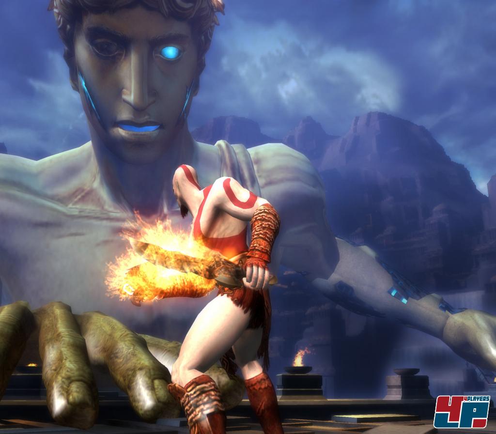 befreien, nicht einhielten! Also rebelliert er auf wenig subtile Weise, und mischt sich durchaus einseitig zugunsten seiner Spartaner-Brüder in diverse Kriege ein, was nach und nach immer mehr Ärger erregt. Schließlich hat nicht nur seine Schirmherrin Athene die göttliche Nase von den Extravaganzen dieses bleichen Emporkömmlings voll: Auf einem Ausflug ins Kriegsgeschehen wird ein Exempel statuiert: Kratos geht all seiner göttlichen Kräfte verlustig, und ganz nebenbei hetzt ihm Athene den zum Leben erwachten Koloss von Rhodos auf den Hals! Dieser furiose Einstieg ist eine haltlos rasende Achterbahn: Vom Hauptmenü geht’s nahtlos ins Intro, das wiederum schneidig in den ersten Level führt, welcher aus einem gigantischen Bossfight besteht – der eure Schweißporen locker eine halbe Stunde auf Hochtouren pumpen lässt, schließlich jagt euch der Koloss durch ganz Rhodos, wirft euch durch die halbe Stadt, ihr zerschneidet seine metallischen Arme und Augen, und gebt ihm schlussendlich von innen heraus den Rest! Habt ihr den Giganten schließlich zum Schweigen gebracht, dreht die Story erst richtig auf, denn an dieser Stelle kommt der stinkige Göttervater Zeus ins Spiel…
