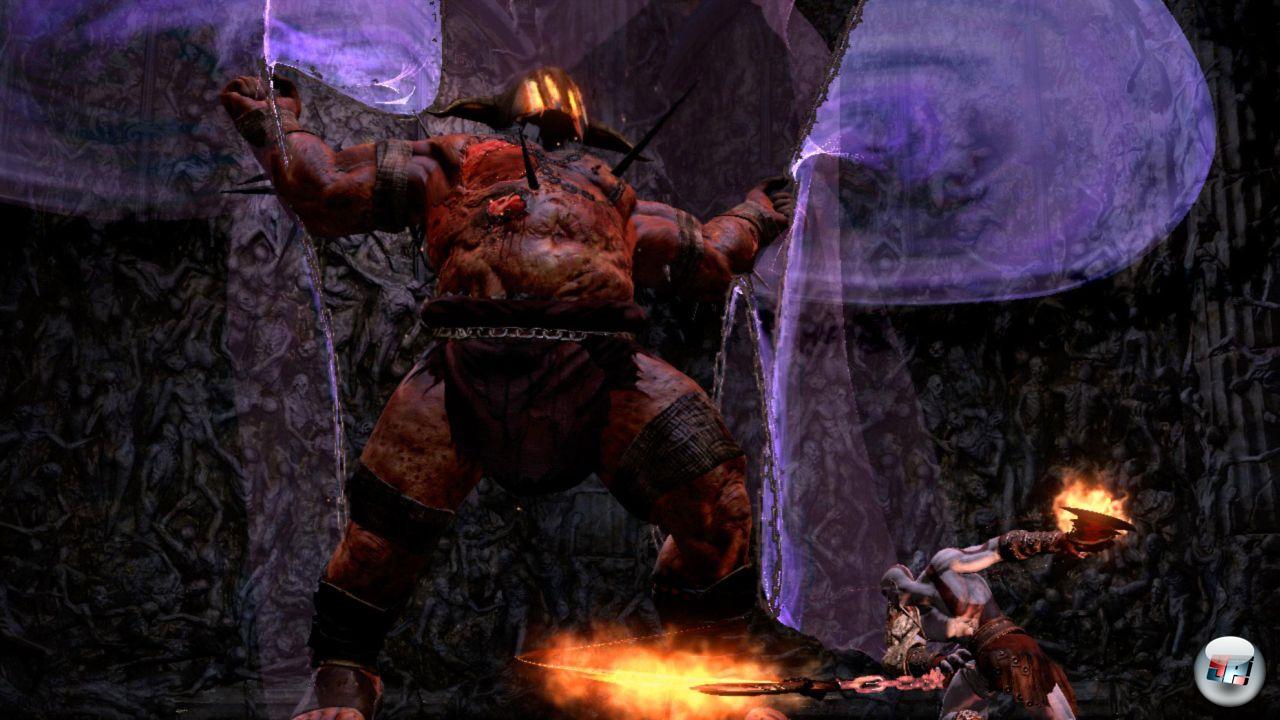 Eine schöne Neuerung findet sich außerdem mit dem Kopf des Helios: Hat man diesen erstmal von seinem eigentlichen Besitzer abgetrennt, lässt er sich in dunklen Höhlen und Räumen genau so verwenden wie etwa die Taschenlampe in Silent Hill: Shattered Memories. Außerdem lassen sich Gegner blenden, wenn man zuvor die Kraft auflädt. Zusätzlich hat der Kopf eine weitere nützliche Eigenschaft: Er kann versteckte Objekte wie Türen, Gemälde, Kisten oder Gegenstände sichtbar machen, wenn man direkt auf sie zeigt. Dazu muss man einfach Ausschau nach einem feinen Goldstaub halten, hinter dem sich meist eine Überraschung verbirgt. Dadurch ergibt sogar das relativ häufige Backtracking, als das erneute Aufsuchen von bereits bekannten Schauplätzen, einen Sinn, da man erst später mit Helios‘ Kopf ausgerüstet ist. Trotzdem hat man es hier teilweise etwas übertrieben – ich hätte lieber weitere Orte besucht anstatt z.B. immer wieder in der Schmiede oder bei den drei Richtern zu landen… Was nicht heißen soll, dass keine Abwechslung geboten wird. Ganz im Gegenteil: Die „Revenge-Tour“ des Spartaners führt ihn u.a. zurück in den Hades, in die Stadt Olympia, den Tartarus, auf und sogar in Titanen wie Gaia und Kronos sowie das Labyrinth des Daedalus – und direkt ins Schlafgemach der attraktiven Aphrodite, wo die obligatorische, aber in diesem Fall bewusst optionale Sexszene wartet, die dieses Mal – wie versprochen – in die Geschichte eingebunden wurde. Das Artdesign ist ähnlich genial wie bei Dantes Inferno; nur auf eine andere Weise: Während der Abstieg durch die neun Höllenzirkel vor allem durch verstörende Motive visualisiert wurde, überzeugt God of War III vor allem durch die unglaubliche Größenwirkung und die monumentale Architektur der antiken Götterwelt. Während die Konkurrenz aus dem Hause EA zudem gegen Ende merklich abbaut, hält der Sony-Krieger während seiner ganzen Reise das extrem hohe Niveau der Kulissen und die Abwechslung aufrecht. Ich habe in den gut zehn Stunden keinen Moment erlebt, bei dem ich mich gelangweilt habe oder hoffte, einen Schauplatz schnell hinter mich zu bringen. Stattdessen blieb ich manchmal sogar stehen, um einfach die fantastische Aussicht zu genießen, wenn in der Ferne Tornados toben und die Erdoberfläche von glühenden Lavaflüssen durchzogen wird, die wie pulsierende Adern wirken. Neben der Metzelaction und Rätseln stehen zwischendurch auch immer wieder Trial & Error-Passagen auf dem Programm, bei