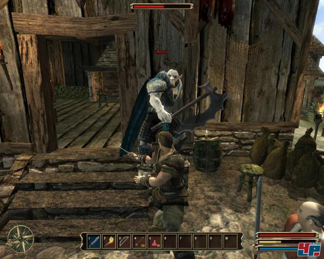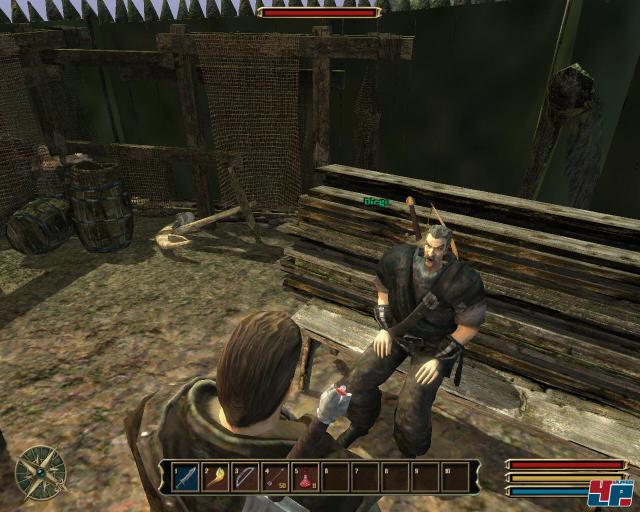 Die Aufrüstmotivation ist da, gar keine Frage. Aber wo ist die erzählerische, wo ist das Drama unter der Oberfläche der Leveltretmühle? Der Einstieg in das Abenteuer kann zwar nicht mit dem packenden Königstod ausOblivion mithalten, ist zwar noch viel versprechend, aber zu nüchtern präsentiert. Im Intro wird ein Schiff gezeigt, das den namenlosen Helden und seine Kumpanen von der Insel Khorinis (Schauplatz der ersten beiden Teile) an die Küste Myrtanas bringt. Warum hört man hier nicht mal die Stimme eines Erzählers, der auf die Geschichte des zweiten Teils eingeht oder vielleicht einen laut ausgesprochenen Gedanken des Helden? Erst später erfährt man in Dialogen, dass die Runenmagie verschwunden ist und die Armeen der Menschen von den Orks besiegt wurden; Reste der Überlebenden haben sich mit einer magischen Kuppel geschützt. Wo ist der König? Was hat es mit dem Verrat des Hexers Xardas auf sich?