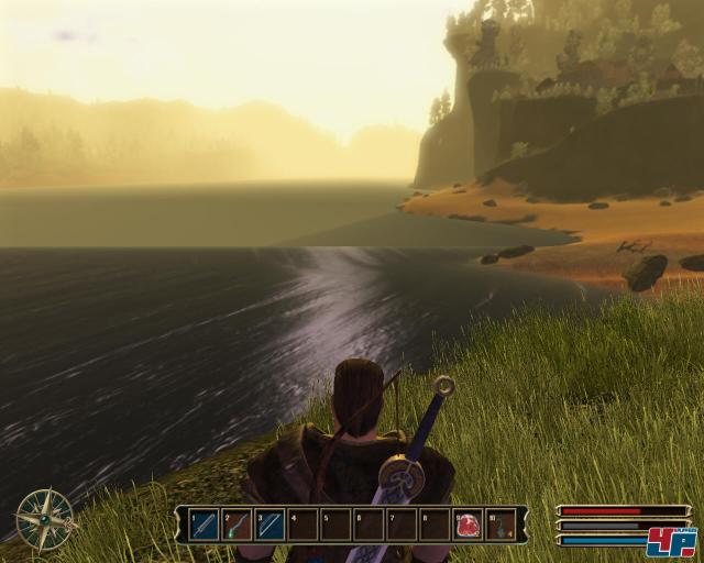 Vielleicht hätte es geholfen, schon früher einen Verbindungsmann einzustreuen, der etwas über den König oder den Kontinent erzählt, oder Zwischensequenzen, die die schrecklichen Momente der Besatzung zeigen. Es fällt mir als Abenteurer auch schwer, mich selbst über das Reich Myrtana zu informieren. Im Gegensatz zu Oblivion gibt es hier kaum Bücher, die etwas über die Geschichte, die Wesen oder Eigenheiten des Landes verraten. Auch das Handbuch zeigt sich hier sehr spartanisch. Wie soll man da einen Bezug zum König aufbauen? Zumal man als namenloser Held ohnehin keine Biografie, keine Ansatzpunkte für Identifikation hat.