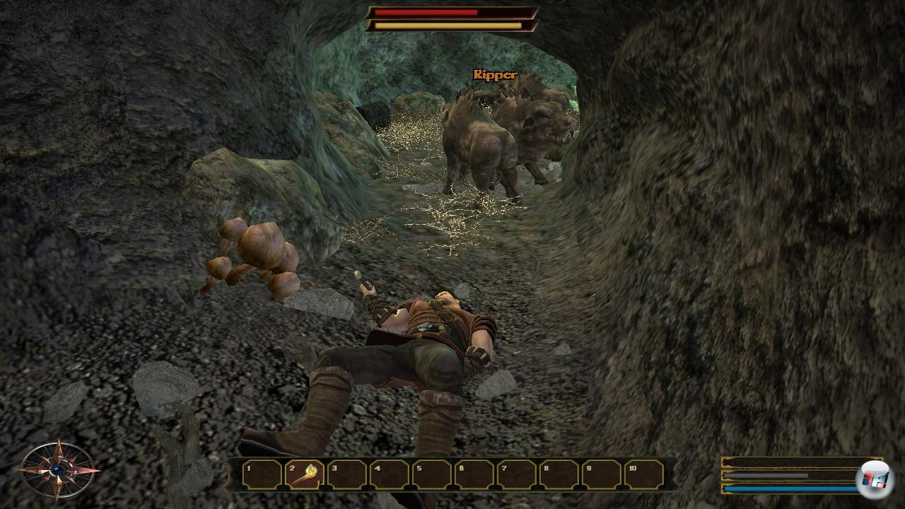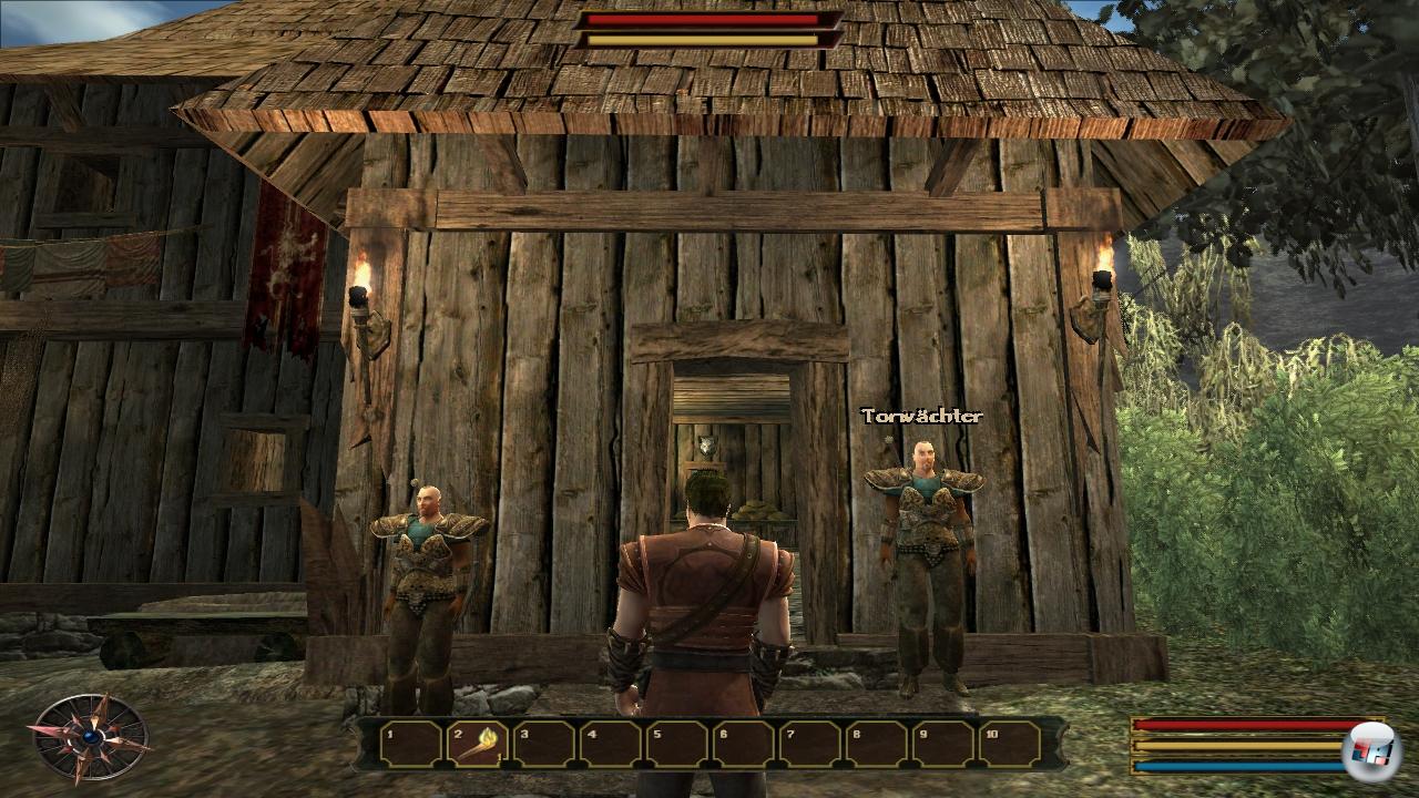 Moral? Konsequenzen? Bis auf einige ignorante Händler, die nach einem Diebstahl partout nicht mit mir reden wollen, kann ich nach Herzenslust in einem Dorf plündern und metzeln. Und das voller Inkonsequenzen: Ein Griff zur Banane macht mich zum Dieb, ein Griff zum zehn mal teureren Orkschlächter daneben im selben Raum (!), hat keine Auswirkungen. Da die Leute in Gothic 3 erst bewusstlos werden und dann wieder aufstehen, als wäre nichts gewesen, macht das gleich doppelt so viel Spaß. Ein Mann namens Anton rennt bei der Flucht übrigens durch die Dorfpalisade und fällt in einen traumhaft schönen Fluss! Ja, das Wasser sieht klasse aus – viel besser als in Gothic 3. Überhaupt wirkt die Landschaft trotz Fade-Ins, Pop-ups und Texturgeflacker homogener und die Sichtweite stabiler als im Vorgänger – hier hat sich das Spiel verbessert.