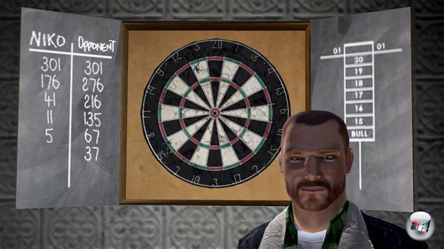 Aber das ist ja, wie gewohnt, nur die eine Hälfte, denn den weitaus größeren Teil eurer Zeit dürft ihr auch mit Nebenaufträgen verbringen. Außerhalb der Hauptstory kann Niko Bellic u.a. Folgendes tun: Darts spielen. Oder Pool.