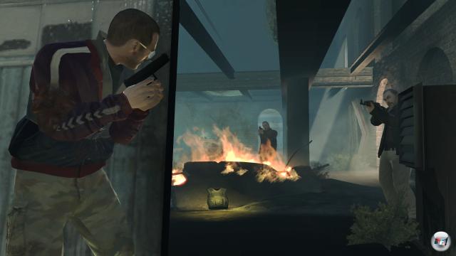 Neuerdings dürft ihr auch einen großen Teil der Umgebung als Deckung nutzen: Ein Druck auf den rechten Schulterbumper, und schon klettet sich Niko an das Nächstbeste, was solide genug aussieht, um ihm Schutz zu geben. Von hier aus könnt ihr gezielt oder auch blind feuern, was den Gefechten eine unerwartet taktische Note verleiht. Ähnliches könnte man auch von der Möglichkeit sagen, aus dem Auto in alle Richtungen feuern können – würde man aber nicht, da sich das sehr fummelig steuert und dankbarerweise auch kaum gebraucht wird. Genauso wenig wie das Hangeln und Schwimmen.