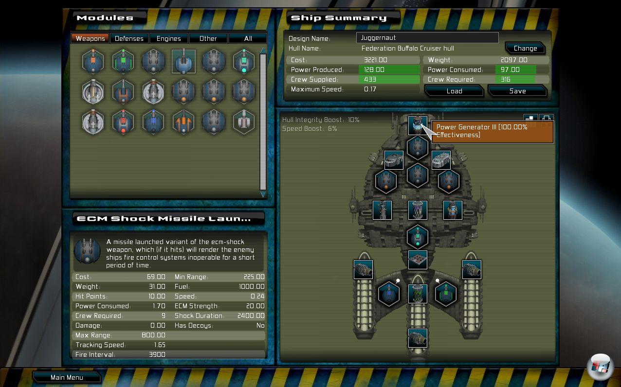 Den Kern bildet der Editor, mit dem ihr eure Schiffe individuell zusammenstellt: Ihr wählt zwischen mehreren Rumpfmodellen, die allesamt unterschiedliche Werte haben und mehr oder weniger Slots für Ausrüstung sowie Bauteile bieten. In diese Slots könnt ihr dann Module wie Antrieb, Schilde, Panzerung, Zielerfassung, Reparatursystem und natürlich jede Menge Waffen platzieren. Alles muss selbstredend mit Energie versorgt werden und ohne fleißige Crew passiert auf dem Schiff natürlich nichts.