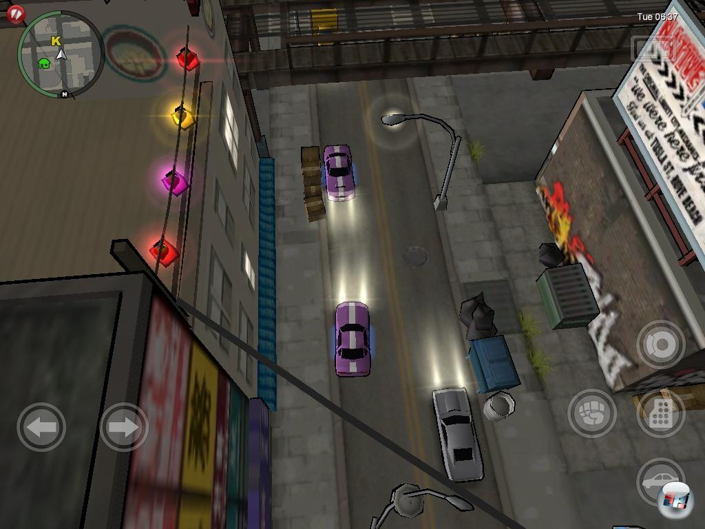 das Geschnatter und Gezetere der Fußgänger für die GTA-Atmosphäre wirklich ist. Die sind in der iPad-Fassung wieder zurück und erfüllen die Spielewelt mit Leben. Ebenfalls an Bord sind wie elf verschiedenen DJ-Stationen, welche die Action mit allen möglichen Stilrichtungen musikalisch untermalen – von Minimal-Electro bis Drum’n’Bass ist alles dabei. Allerdings gibt es auch auf dem iPad keine (wie von den letzten GTA-Spielen gewohnt) lizenzierte Musik. Wer also auf Gesang wert legt oder in den Radiostationen nichts findet, was seinem Geschmack entspricht, kann auch auf dem iPad gespeicherte eigene Mucke genießen. Allerdings muss man, wie schon auf dem iPod etwas umständlich eine spezielle Playliste dafür anlegen.![]()
