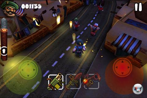 Ironie oder ambitionierte Entwickler? Obwohl das iPhone bzw. der iPod touch nicht einen Analogstick ihr Eigen nennen, ist das Genre der Zweistick-Shooter auf Apples Gerät erstaunlich präsent. Auch Guerrilla Bob schlägt voll in diese Kerbe: Mit dem linken virtuellen Knüppel