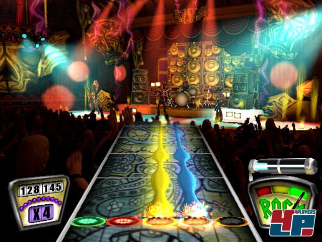 Zurück zum Kontroll-Gerät und den sich anbietenden Möglichkeiten, die es schaffen, das „echte“ Gitarrieren nahezu komplett nachzuahmen: Abhängig vom gewählten Schwierigkeitsgrad müssen drei bis fünf der farbigen „Bundköpfe“ am Hals der Gibson SG im Takt bedient werden, wobei die so genannten Power Chords genau so nachgespielt werden müssen wie filigrane Solo-Läufe. Die imaginären Seiten werden über den Anschlaghebel zum Klingen gebracht, der sich wie ein echtes Plektrum sowohl nach oben als nach unten bewegen lässt, um auch schnelle Passagen bewältigen zu können. Mit der ebenfalls vorhandenen „Whammy Bar“ lassen sich lang gezogene Töne zusätzlich verfremden, so dass das authentische Spielgefühl vervollständigt wird. Ebenso wie mit den auch im Spiel anwendbaren Techniken des „Hammer-Ons“ und „Pull-Offs“, die auf den höheren Schwierigkeitsstufen den Rettungsanker im Sturm verteufelt schneller Sololäufe darstellen.