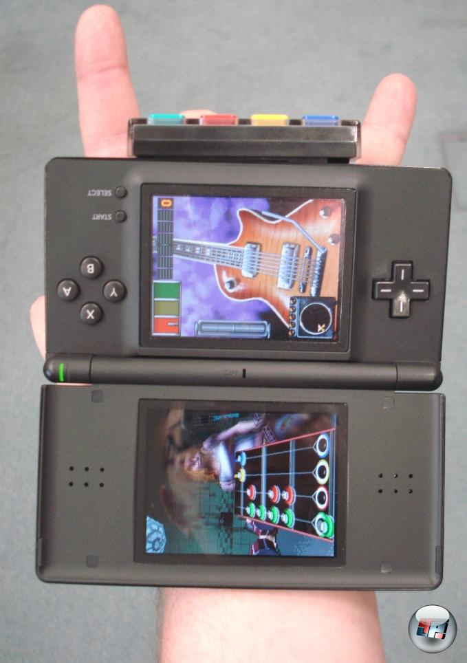 Zweitens: Die Zuverlässigkeit. Der Guitar Grip steckt zwar relativ fest im GBA-Schacht, aber nicht bombenfest. Durch das ständige Fingergewackel und Tastengedrücke wird das Modul in jedem Fall über kurz oder lang verschoben – und irgendwann so weit, dass es sich ausgerockt hat, was im Kleinrockeralltag öfter passiert, als einem lieb sein dürfte. Nun sollte man denken »Och, dann stecke ich das Teil eben einfach zurück und weiter geht’s!« – falsch gedacht, geschätzter Leser, denn in diesem Fall ist das Spiel vorbei, der DS muss aus- und wieder eingeschaltet werden. Speziell innerhalb einer fetzigen Mehrspielerpartie höchst ärgerlich!