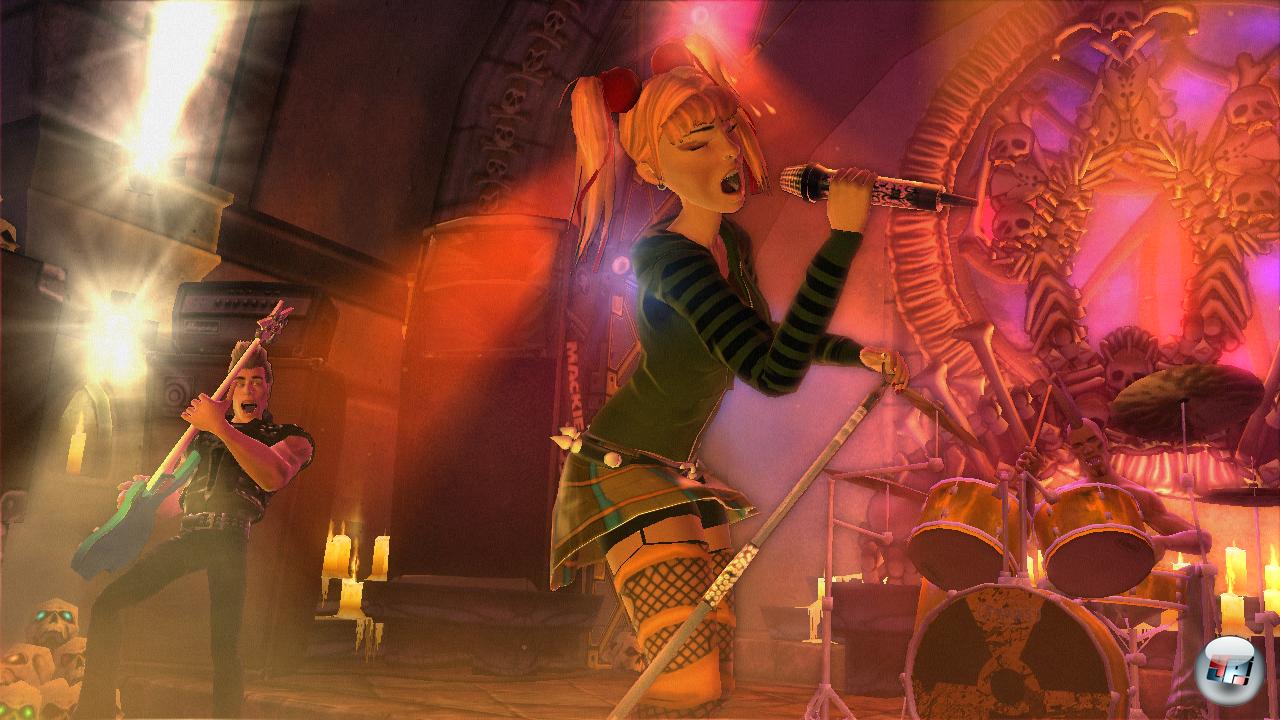 Von Seiten der Ohren beherrschen natürlich die Songs den Gehörgang – dazu wurde ja bereits mehr als genug geschrieben. Allerdings gibt es von akustischer Seite einige Fragwürdigkeiten: Zum einen geht das Publikum nach wie vor nur ab, wenn die Starpower aktiviert ist – und da auch nicht ansatzweise so geil wie in Rock Band, wo ganze Textpassagen aus Hunderten Kehlen mitgegrölt wurden. Zum anderen ist das Schlagzeug extrem leise: Ihr könnt zwar das Volumen jedes einzelnen Instruments nach Belieben einstellen, aber dennoch bleiben die Drums unterrepräsentiert.