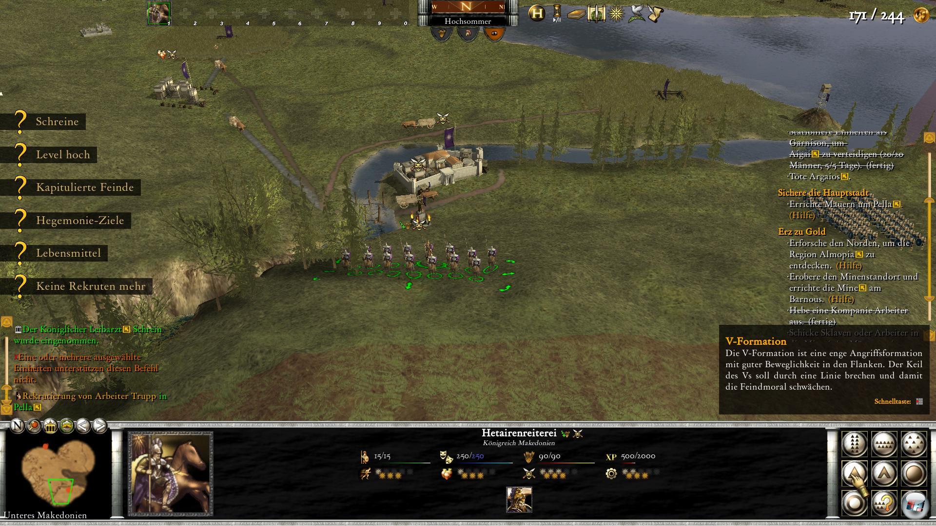 dass es klare Etappenziele gibt, die militärischer, wirtschaftlicher oder imperialer Natur sind. Zunächst stellt man eine kleine Truppe auf, die aus schweren Reitern und König Philipp besteht, deren Verschmelzen aufgrund der Steuerung nicht immer reibungslos klappt. Damit erobert man erste Nachbarorte, die noch ohne schützenden Wall sind. Weiter kommt man aber nur, wenn man ein Zwischenziel erreicht. So muss man erst Bardylis besiegen, damit man weiter ziehen kann. Einmal muss man auch eine Mauer um Pella errichten, damit es endlich zur makedonischen Hauptstadt wird. Als Belohung bekommt man öfters neue Einheiten, die man gleich einsetzen kann.