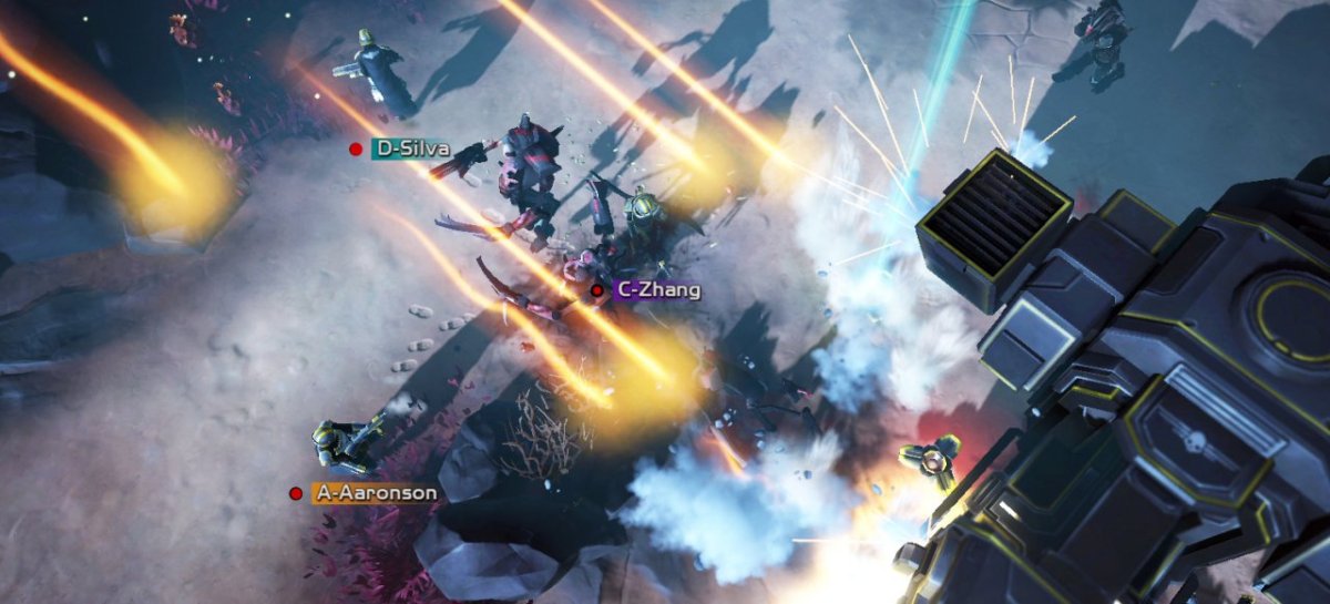 Wer in Helldivers den Rambo spielt, kommt nicht weit. Vor allem das aktivierte Friendly-Fire sorgt für unerwünschte Nebeneffekte: Ein paar Schüsse in die falsche Richtung und schon krabbelt ein Mitspieler blutend über den Boden. Zum Glück lässt er sich schnell verarzten  – oder man lässt gefallene Kameraden mit in der Mission verdienten Neustarts wieder erscheinen. Trotzdem will gerade zu viert jeder Schritt überlegt sein. Ein Spieler lädt nach, der andere deckt ihn. Der dritte hat schon kurz vorher ein automatisches Geschütz gegen die anrückenden Horden angefordert und springt in Deckung, damit er nicht selbst davon niedergemäht wird. Am besten teilt man Aufgaben und Schussrichtungen klar per Chat oder kurzen Kommandos mit und stapft auch in schwer bewaffneten Exoskeletten nur vorsichtig voran. Ein unbedachter Seitenschritt im Getümmel und schon ist der Kollege Mus.