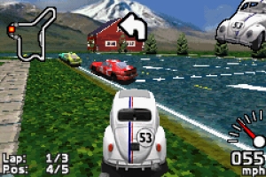 Nummer 53 lebt Was tut ein VW Käfer den ganzen Tag? Fahren, fahren, fahren. Und genau das macht ihr hier auch: Euch erwarten 16 Strecken, die ihr in drei Spielmodi abrasen dürft: In der Story-Variante schaltet ihr neue Levels frei und bekommt zwischen den Rennen grob digitalisierte Bilder aus dem Film zu sehen. »Championship« und »Free Race« bieten dasselbe, minus der Bilder, aber plus dreier wählbarer Schwierigkeitsgrade. Die haben allerdings kaum spielerischen Einfluss, denn die dumpfbackigen Gegner sind nur kurz eine Herausforderung: Sie meiden kaum ein Hindernis, tummeln sich mehr auf dem langsam machenden Streckengras als auf der Straße und fahren grundsätzlich im Rudel – keinerlei Anzeichen künstlicher Intelligenz erkennbar. Mehr Spielvarianten gibt’s nicht, einen Mehrspielermodus hat sich Entwickler Disney komplett gespart. Drauflosgehüpft! Kein Wunderauto ohne Wunderfeatures: In Herbies Fall kann er, ein eingesammeltes Extra vorausgesetzt, auf mehrere Arten beschleunigen (u.a. rückwärts fahrend!), zu einem prinzipiell nie gebrauchten Hüpfer ansetzen und mit dem nicht benötigten Ersatzreifen nach Konkurrenten werfen. Der Käfer steuert sich sehr simpel, im Grunde muss man nur aufpassen, nicht einen Millimeter außerhalb der Strecke oder in eine Ölpfütze zu fahren – in solchen Fällen wird das Auto sofort heruntergebremst und muss erst wieder elend träge beschleunigen. Optisch bietet das Game nichts, was es nicht schon vor Jahren auf dem GBA gegeben hätte: flotte, aber detailarme und grob gerasterte Strecken ohne Höhenunterschiede, deutlich ins Bild poppende 3D-Objekte und potthässliche, weil farbarme Gegner – nur Herbie selbst kann sich sehen lassen. |  | Fakten: – drei Sprachen – ein Savegame – automatisches Speichersystem – 16 Strecken – Herbie-typische Extras – drei Spielmodi – digitalisierte Filmbilder zwischen den Missionen – drei Schwierigkeitsgrade Pro / Kontra: + einfache Steuerung + schönes Herbie-Modell + flotte Optik – kein wählbarer Schwierigkeitsgrad im Story-Modus – ausschließlich flache Strecken – grobe, farbarme Grafik – dumpfe Gegner – kein Mehrspielermodus – miese Kollisionsabfrage – immergleiche Strecken  | | Die Kurse sind platt wie Stullen, die Gegner extrem farbarm – nur Herbie selbst ist optisch gelungen. |