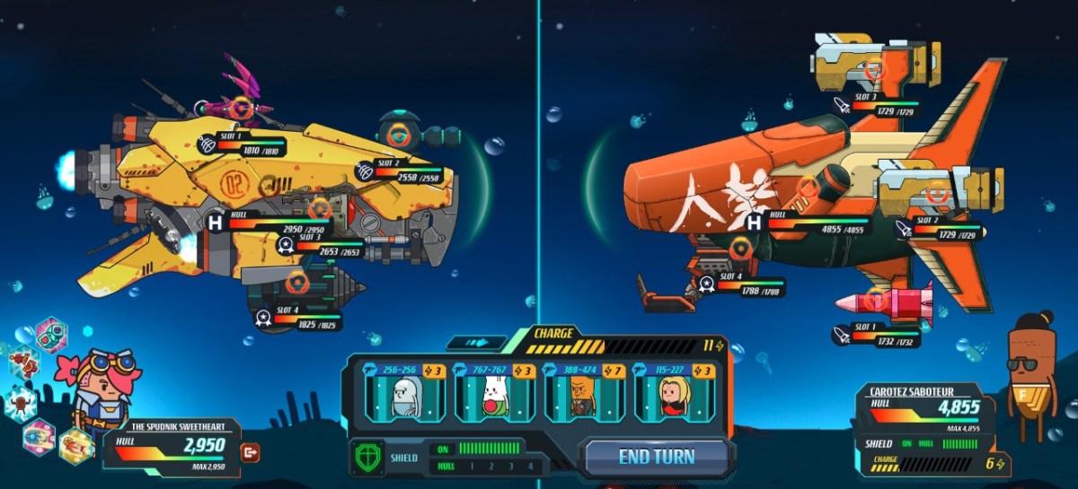 Es sind immer zwei, mit bis zu vier Kanonen bewaffnete Raumschiffe, die sich hier gegenüberstehen: Die feuern nicht in Echtzeit, sondern abwechselnd im Rundenrhythmus – und zwar mit so vielen Geschossen wie die Aktionspunkte, Ladung genannt, hergeben. Auch Spezialfähigkeiten kosten Ladung, erhöhen dafür die Wahrscheinlichkeit gegnerischem Feuer auszuweichen oder verstärken die eigenen Geschosse.