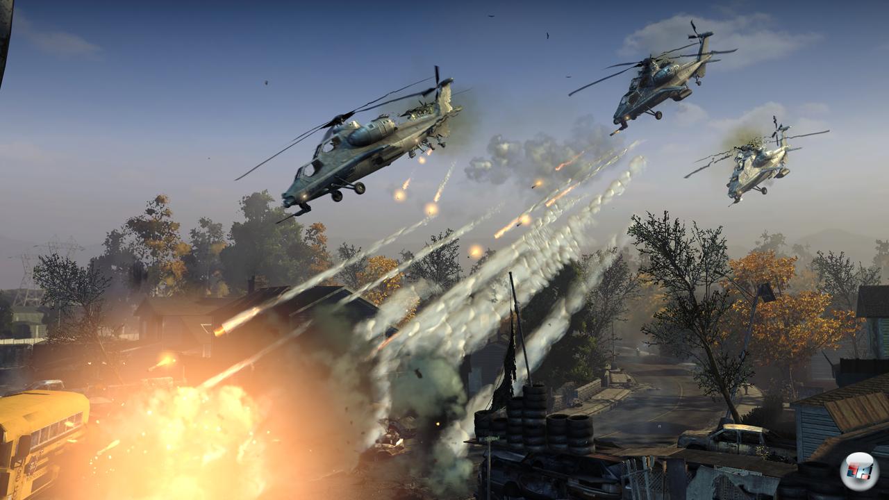 Die Währung bei Homefront sind die so genannten Kampfpunkte, die man auch für das Töten von Feinden, dem Einnehmen von Basen oder Unterstützungs-Kills auf seinem Konto gutgeschrieben bekommt. Das Schöne daran: Die Punkte lassen sich schon während einer Schlacht sinnvoll in bis zu zwei Gadgets investieren, die man bereits im Vorfeld für jede Klasse (Schütze, Scharfschütze etc.) neben der Bewaffnung festlegen kann. Dadurch hat man z.B. die Möglichkeit, sich auf Knopfdruck (und gegen Bezahlung) mit einer Panzerfaust ausstatten zu lassen, wenn man als einfacher Schütze plötzlich mit einem Panzer konfrontiert wird. Während man sich bei einer solchen Bedrohung in anderen Spielen schon auf das vorzeitige Ableben und den anschließenden Respawn einstellt, kann man hier noch Gegenwehr leisten, was den Schlachten insgesamt mehr Dynamik verleiht. Im Gegensatz zur Kampagne spielen hier außerdem auch die Vehikel wie Humvees, Panzer und Hubschrauber eine größere Rolle. Auch die Dronen sind endlich wieder mit von der Partie, so dass man ferngesteuerte Mini-Helis oder bewaffnete Roboter losschicken kann. Selbst das Anfordern gezielter Luftschläge wird möglich, sobald man eine gewisse Serie hingelegt hat. Vor allem später, wenn das Kampfpunkte-Konto entsprechend angewachsen ist, schwenkt der Fokus immer mehr von Infanterie- zu Vehikel-Scharmützeln um, weil man sich das entsprechende Equipment leisten kann. Die meisten Fahr- und Fluggeräte sind für mehr als einen Spieler konzipiert, so dass Aufgabenteilung angesagt ist. Während der eine fährt, kümmert sich der andere z.B. um die Kanone. Wer will, kann nach einem Tod sogar direkt im Vehikel eines Mitspielers erneut in die Schlacht einsteigen. Um Campern entgegen zu wirken, gibt es außerdem eine Kill-Cam, die die Position des Spielers verrät, der einen gerade um die Ecke gebracht hat.