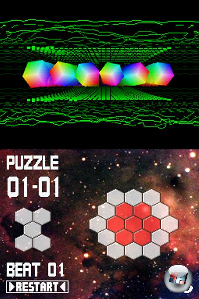 Tippt ihr mit dem Stylus auf eine der Waben, dreht ihr nicht nur sie um, sondern auch alle angrenzenden Sechsecke. Die Rückseiten der gelben Waben sind weiß. Ziel ist es, mit einer vorgegebenen Zahl an Zügen sämtliche Waben umzudrehen und dem kompletten Feld ein blütenweißes Aussehen zu verpassen. Klingt einfach, ist es aber nicht immer, da eben auch sämtliche benachbarten Waben ihre Farbe ändern, wenn ihr ein Feld antippt. Ihr müsst also strategisch vorgehen und ein wenig um die Ecke denken. Für Abwechslung sorgen die Spezial-Waben, mit dessen Hilfe ihr z.B. eine komplette horizontale oder diagonale Reihe umdreht.