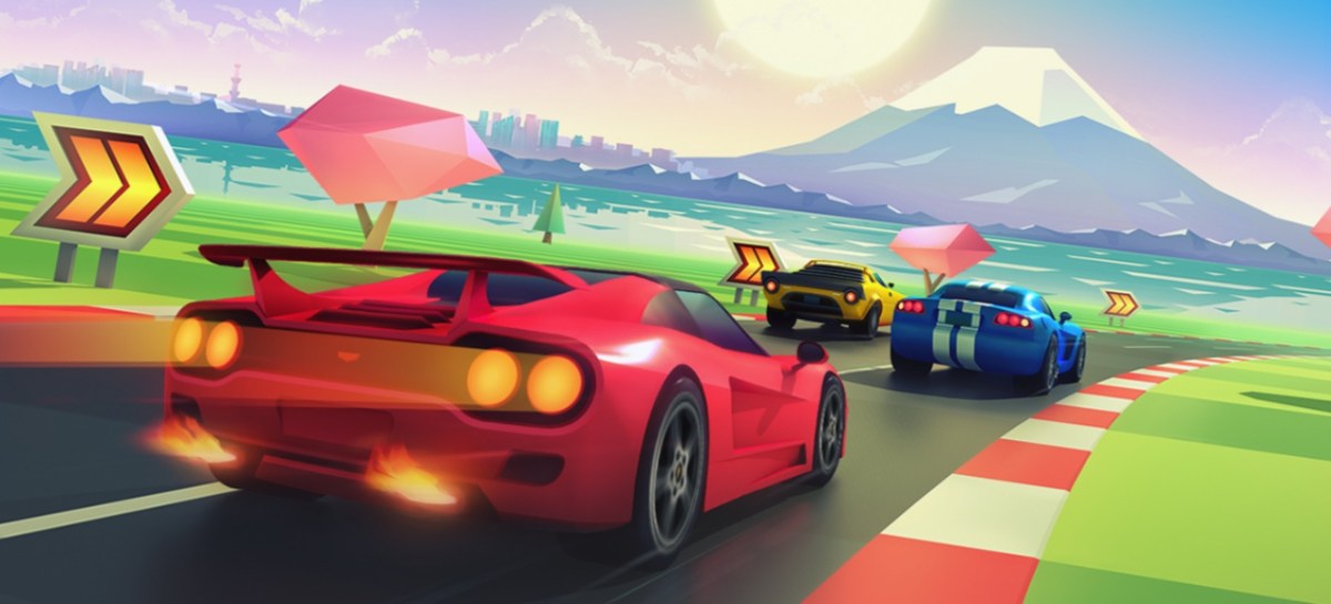 Wieso ich ein Spiel, das mir offenbar überhaupt nicht gefällt, noch ein zweites und ein drittes Mal herunterlade? Weil Horizon Chase so verdammt verlockend klingt und aussieht. Immerhin rast man hier in einer, sagen wir mal: grafisch modernen Version von Outrun, Lotus, Top Gear und wie sie alle heißen umher, lauscht einem Soundtrack von… huch: den hat doch tatsächlich Barry Leitch geschrieben, auf dessen Kappe mit der Titelmusik zu Lotus 2 einer der größten 16-Bit-Klassiker geht! Und der in der Zwischenzeit nichts verlernt hat, denn die Musik zu Horizon Chase ist eine schmissige Playlist, die logischerweise mal an
