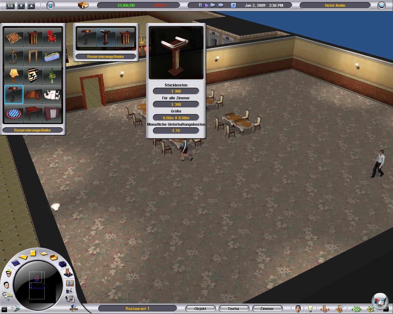 versogt: Einem wahren Wust an Einrichtungsgegenständen – insgesamt sind es um die 1.400. Da wird sogar Ikea neidisch, da es alles gibt; von der Badewanne über TV-Geräte bis hin zum Lichtschalter. Das Ganze natürlich noch in verschiedenen Preisklassen, wobei nicht immer ganz klar ist, warum das hässliche Ding nun teurer ist als das besser designte. Das viele Kleinklein bringt es mit sich, dass ihr euch wirklich um jeden Mist kümmern müsst. Sogar übers Fernsehprogramm motzen die Gäste, deren Vorlieben ihr erfüllen müsst. Immerhin ist es so, dass eich eine Raumänderung auf alle auswirkt.