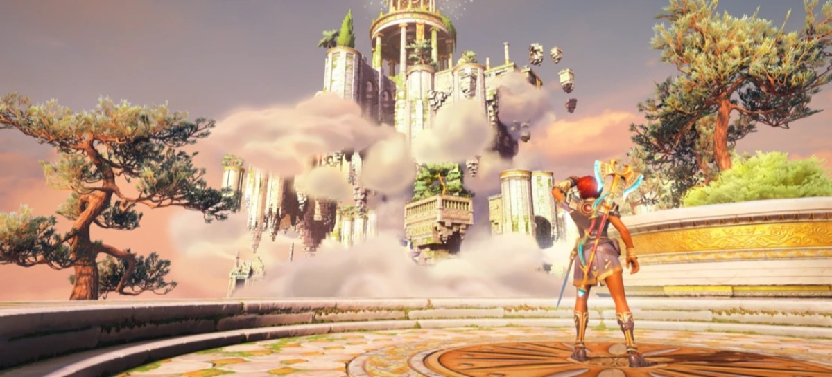 Doch nun wieder zum spielerischen Gehalt der (14,99 teuren) Dreingabe: In der neuen Himmelswelt angekommen, klärt mich Hermes darüber auf, dass sich mir, der kleinen Heldin Fenyx, eine tolle Gelegenheit bietet: Ich kann in den inneren Kreis des Pantheon, also den nur 12 Götter umfassenden engsten Zirkel (Dodekatheoi) aufsteigen. Dazu muss ich vorher nur noch… eine große Menge Zusatzprüfungen absolvieren und 24 Artefakte sammeln. Gesagt getan: Ich besuche die, ebenfalls in dieser Palastwelt (ohne Natur, ohne Wiesen und Meer, ohne Schluchten und Berge drumherum) gelegenen Horte von Aphrodite, Ares, Athene und Hephaistos. Dort treffe ich die vier Götter wieder, die schon im Hauptspiel den Ton angaben: Jeder wird im DLC-Verlauf eine neue Fähigkeit für meine Fenyx haben (z.B. Mega-Stärke, Aufwind-Manöver, Dash durch rote Barrieren) und schickt mich nach und nach zu verschiedenen Portalen. Von dort aus geht es zu Mini-Welten, die in puncto Aufbau an die Tartaros-Dungeons des Hauptspiels erinnern – allerdings dominieren nicht weiter die kühlen Blau-Töne, sondern die goldene Sonne und wunderschönen Wolkenhimmel wie in der DLC-Hubwelt.