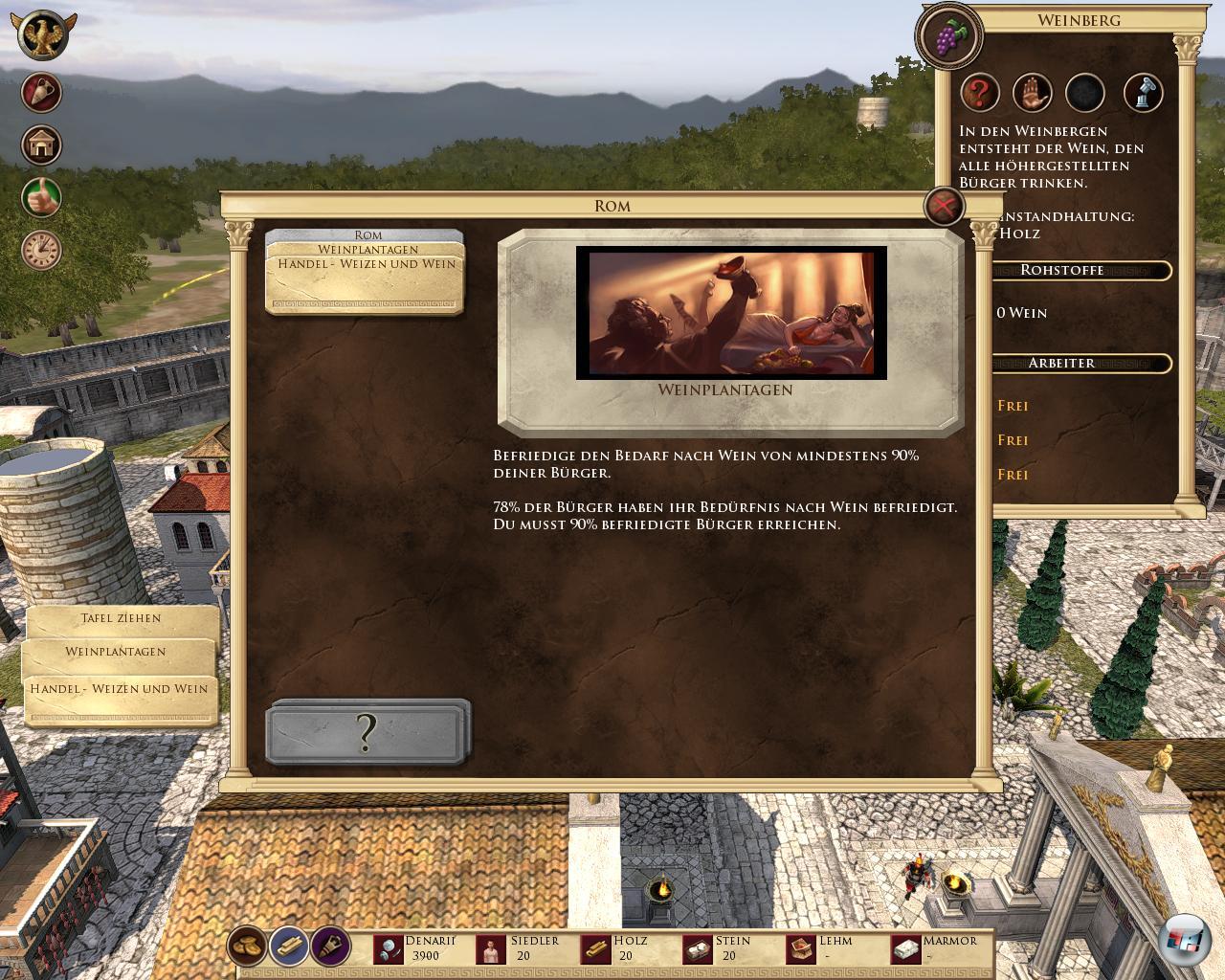 wie der Aufstieg hier Schritt für Schritt verschaltet ist. Es beginnt mit leichteren Aufgaben, wie dem Bau von Gebäuden wie Metzgerei oder Präfektur. Dann geht es über einen Rekord an Lebensmittel, den ihr ereichen sollt und dem Erobern eines Dorfes bis zum Bau eines Circus Maximus. Das steigert sich und ist motivierend gemacht, auch weil ihr entscheiden könnt, wann es weiter gehen soll, da ihr die Aufgaben enthüllt. Als Belohnung erhaltet ihr z.B. Geld, Gratisbauwerke oder neue Siedler.