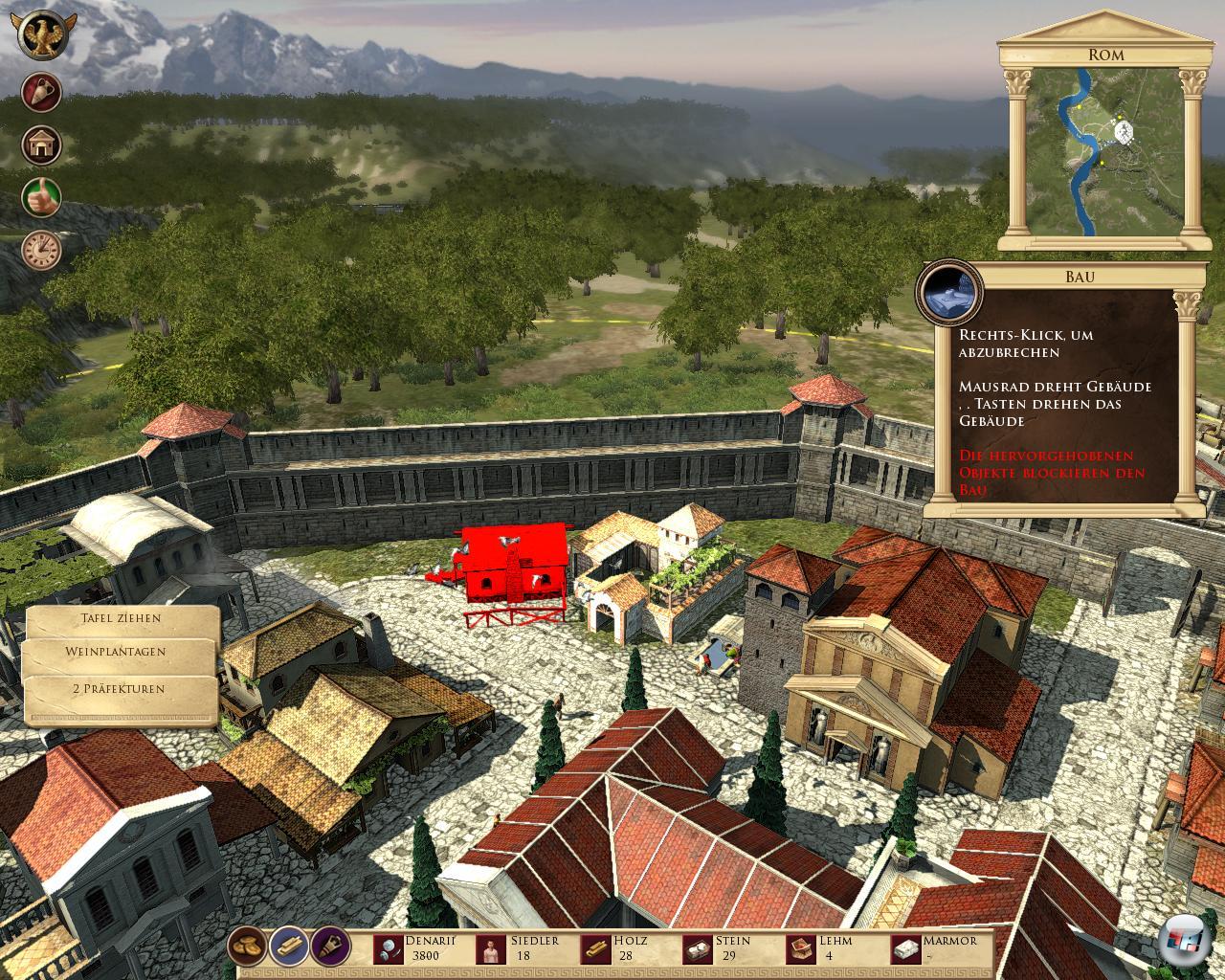 Immer wieder wurde die antike Kulisse als wunderschön und detailreich gepriesen. Optisch hat Imperium Romanum durchaus einiges zu bieten. Da gibt es schöne, antik aussehende Gebäude wie etwa Forum, Tempel oder Schulen. Eine gewisse Eckigkeit der Bauten fällt aber negativ auf, die sich bei den Hütten der Barbaren bemerkbar macht. Immerhin haben sich die Macher die Weichspüleffekte des Vorgängers weitgehend gespart und das Wasser sprudelt nun auch verbessert aus dem Aquädukt. Auch der Circus Maximus sieht prächtig aus mit seinem Innenraum, Bögen und Säulen, ist aber oft nicht gut besucht und das Renngeschehen könnte fesselnder sein. Auch der Wuselfaktor auf der Straße ist eher begrenzt, da zwar Leute zu sehen sind, aber eben keine Massen.