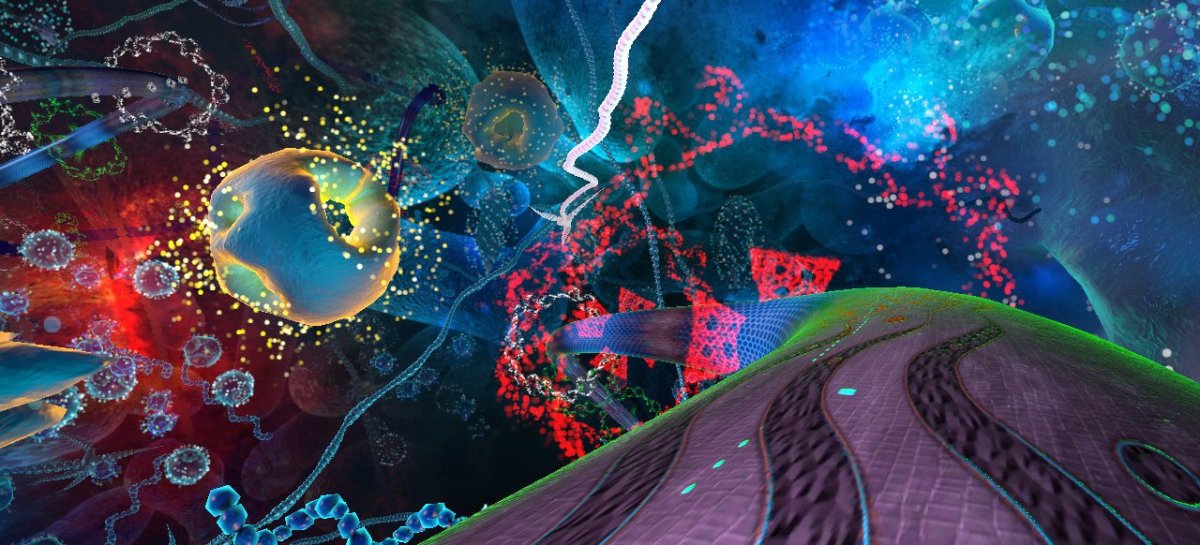 Das mag ziemlich fade klingen, ist dank der hübschen Präsentation und der immersiven Umsetzung aber eine Weile lang recht unterhaltsam. Vor allem in den ersten Minuten habe ich mich immer wieder staunend umgesehen, um die bunten, teils leuchtenden Innereien der Zelle zu begutachten. Die Entwickler haben sich den realen Aufbau als Vorbild genommen, ihn für das Spieldesign aber ein wenig angepasst und verschönert. Am angenehmsten funktioniert die Steuerung per Kopf-Tracking der Oculus-Rift-Kamera. Mit „normalen“ Bewegungen sehe ich mich um, damit ich die Kurven auf der sich schlängelnden Bahn früh genug entdecke; gelenkt wird per Kopfneigung. Ich weiß nicht warum, aber das sanfte Hin- und Herwiegen des Kopfes fühlt sich erstaunlich natürlich an und schlägt mir nicht auf den Magen. Köpfchen ist besser als Daumen