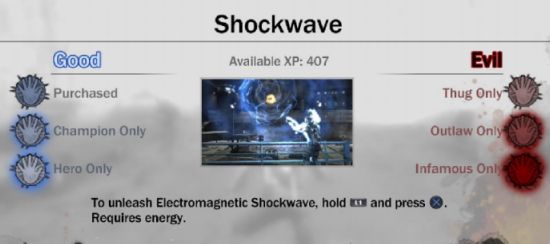 Je nach Karmawert kann man kräftigere Blitze, Schockwellen & Co freischalten. Wer effizient sein will, sollte sich also auf Gut oder Böse spezialisieren!