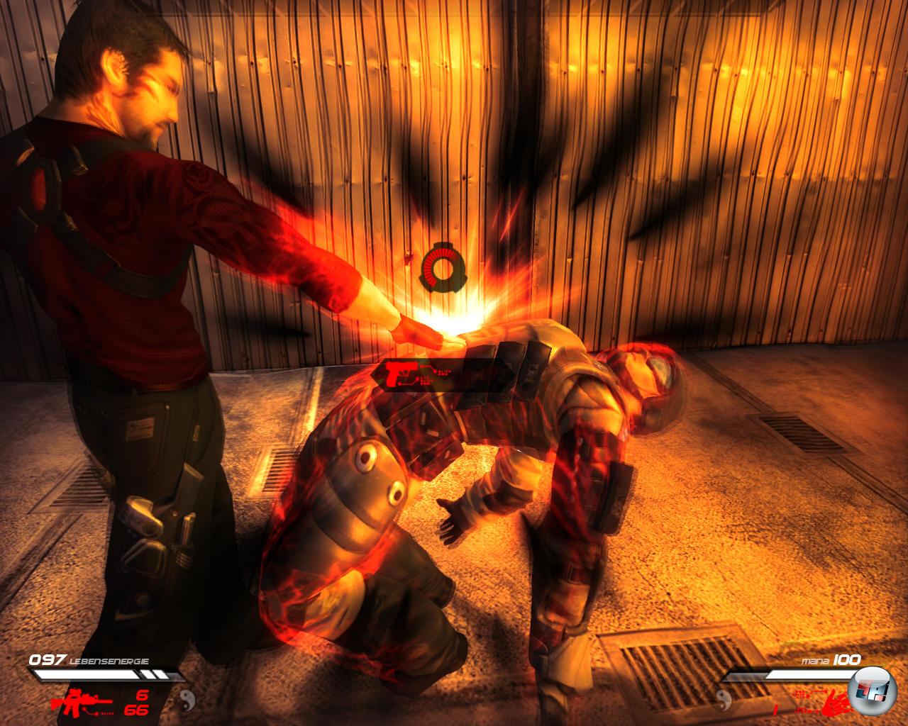 Als verlängertem Arm des Gesetzes der Hölle stehen Ryan neben den üblichen weltlichen Argumentationsverstärkern auch diabolische Kräfte zur Verfügung: Gleich die erste ist mangels Heilpäckchen sehr nützlich, denn er kann besiegten Gegnern in dramatischer Präsentation (der Bildschirm färbt sich blutrot, wabert leicht, mächtige Lichtstrahlen überall) die Seele aussaugen! Danach bleibt von dem entgräteten Widersacher nicht mal mehr die schlaffe Hülle übrig, er löst sich in Wohlgefallen auf. Das hat neben dem Gewinn an Lebensenergie auch gleich noch den Vorteil, dass ihr die Taschen des Opfers nach Waffen und Munition durchwühlt. Ausgefallen, aber auf Dauer etwas lästig, da unnötig zeitaufwändig. Dennoch ausgefallen. Weiterhin kann sich Ryan begrenzt teleportieren, was nicht nur dazu dient, an sich unerreichbare Schalter zu bedienen, sondern sich auch in den Rücken von frontal zu gut gepanzerten Gegnern zu beamen, und sie von dort aus einfacher zu erledigen. Am besten mit dem infernalen Schussverstärker, der die normale Waffenfunktion ordentlich potenziert. Praktisch auch Höllensicht und Telekinese, kann man doch mit Ersterem versteckte Zugangscodes finden und mit Zweiterem im Weg stehende Kisten