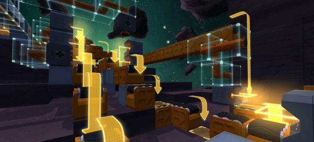 Es ist so einfach: „Transportiere zehn Quader vom Eingang zum Ausgang.“ Wie in Minecraft klicke ich Blöcke nebeneinander, auf denen die Würfel wie auf einem Laufband ans Ziel befördert werden. Kniffliger wird es, wenn ich drei verschiedene Quader so verbinden muss, dass sie als ein Ganzes den Ausgang erreichen. Dann baue ich an zwei nebeneinander liegenden Stellen statt der Laufbänder funktionslose Blöcke und installiere daneben Blöcke, welche die Quader zusammenschweißen. Zwei Würfel stehen dort so lange auf den funktionslosen Steinen, bis ein dritter die Gruppe auf das dahinter liegende Laufband schiebt und gleich mit verschweißt wird – fertig ist das gesuchte Bauteil.