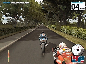 wahren Geschwindigkeitsrausch gepackt und die Landschaft zischt mit konstanten 60 Frames an euch vorbei. Doch leider geht die Geschwindigkeit auf Kosten der Streckendetails und so gibt es abseits der Piste bis auf ein paar lieblose Häuser, sich immer wiederholende Bitmap-Büsche und von einigen Pop-Ups geplagte Bäume nicht sonderlich viel zu sehen. Stellenweise erinnert die flimmeranfällige Grafik an ein PSone-Spiel und hinkt anderen Genre-Vertretern wie Namcos und THQs MotoGP-Serie weit hinterher. Die Modelle der insgesamt etwa 50 lizenzierten Motorräder reichen von der 125cc- bis zur 1000cc-Klasse und sehen passabel aus. Das gilt auch für die Fahrer, die nur dank ihrer guten Animationen überzeugen können – das Aussehen ist eher klobig. Neben zwei Innen- und einer Außerperspektive ist vor allem die Cockpit-Ansicht mit Windschutz sehr gut gelungen, auch wenn diese sich aufgrund des eingeschränkten Sichtfeldes hauptsächlich an Profis richtet.