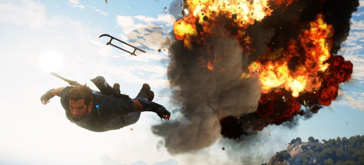 Ich bin in meinem Element: Der Gastank explodiert in einem gleißenden Feuerball. Die in dutzende Teile zerborstene Metallhülle bohrt sich durch in der Nähe stehende Treibstofftanks, Transformatoren und Radaranlagen, die ebenfalls allesamt jeweils mit einem lauten „Rumms“ in einer eindrucksvollen Explosion ihren Geist aufgeben. Dank etwas Glück hat eine Sprengladung die gesamte Infrastruktur dieser Militärbasis lahmgelegt. Moment mal: Dort ist noch ein Tank wie ein Wunder von dem blendend hellen Feuerchaos verschont geblieben! Mist, ich habe keine Granaten mehr. Und nur noch einen Schuss im Raketenwerfer, den ich mir allerdings lieber für den eventuellen Angriff eines Helikopters oder eines Gegners mit Schnellfeuergeschütz aufbewahren möchte. Zum Glück habe ich noch meine Wurfhaken. Einfach ein Fass mit einer explosiven Flüssigkeit anvisiert: Zack, der erste Haken sitzt. Mit dem zweiten visiere ich den geschätzt etwa 10.000 Liter fassenden Tank an. Zack, getroffen. Mit einer Fernbedienung kann ich nun das zwischen beiden gespannte Seil mit hoher Geschwindigkeit einfahren. Das Fass rast auf den Tank zu. Bumm. Herrlich – diese Action kann so schön zerstörerisch sein!