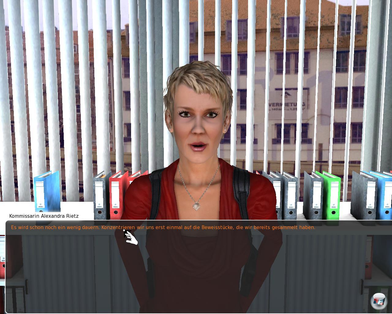 Danach befragt einen die Kollegin mit dem tiefen Ausschnitt, ob man alles verstanden hat. Das ist wie alle Dialoge im Spiel weder schwer noch gut gemacht. Man muss immer alle Themen abklappern, so dass die Gespräche auch nicht wirklich interaktiv sind. Wer darüber hinaus denkt, dass mit der was laufen könnte, hat erstens noch nie K11 gesehen und überschätzt zweitens die Möglichkeiten des spröden Adventures von Sproing Interactive, denn alles, was privat und damit interessant wäre, bleibt außen vor. Man erfährt also nichts über sie, was man nicht schon aus der Serie wüsste. So bleiben die Kollegen Abziehbilder, die austauschbar sind.