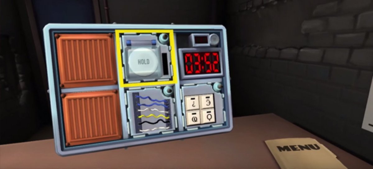 Im aktuellen „Bomb Defusal Manual – Version 1“ (nur in englischer Sprache) werden elf Module beschrieben, die in den zufällig generierten Bomben in zufällig generierten Varianten vorkommen können. Die Entschärfung jedes Moduls ist ein eigenes Minispiel aus den Kategorien „Merken“, „Koordination“, „Konzentration“ und natürlich „Kommunikation“. Während das Durchschneiden von Kabeln wohl die klassischste Version beim Bombenentschärfen ist und mit abzuarbeitenden Anweisungen in Textform einhergeht, muss man gelegentlich mit einem großen Knopf mit wechselnder Aufschrift wie „Detonate“ oder „Press“ hantieren. Hierbei berichtet der „Entschärfer“, was er sieht und der „Handbuchexperte“ stellt Fragen basierend auf der Dokumentation. Und dann ist mehr oder weniger klar, was zu tun ist.