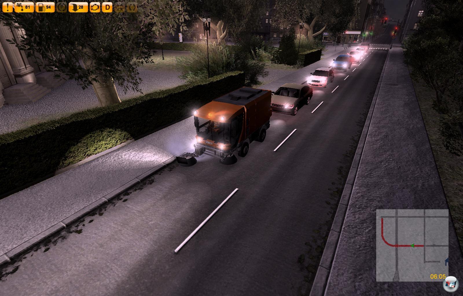 Damit kommt dann nochmal ein wenig Abwechslung ins Spiel, aber es ändert sich nichts Gravierendes. Meistens sind Straßen zu reinigen, manchmal auch Plätze und Wege, das war’s. Technisch und optisch wird das alles solide inszeniert. Insbesondere die zahlreichen Nachteinsätze können sich sehen lassen: Wenn der „Bürstenscheinwerfer“ seinen Lichtkegel auf meinen Arbeitsplatz wirft und die Warnleuchte die unmittelbare Umgebung in oranges Licht taucht, kommt sogar kurzzeitig so etwas wie „Stimmung“ auf.