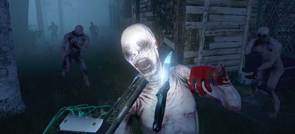 Sicher, man könnte auch die Schrotflinte vom Rücken oder eine der zwei Pistolen aus dem Holster ziehen, doch das schnelle Wedeln erweist sich gegen die herbeiströmenden Hirntoten als deutlich effektiver. Knirsch, flatsch, knirsch – fertig ist das Mett aus Zombies, die brav wie an der Perlenkette herbeiströmen, so dass man sich tatsächlich oft wie am Fließband fühlt. Okay, der Name Killing Floor verrät gewissermaßen, womit man es zu tun hat. Andere VR-Shooter wie Farpoint oder Until Dawn: Rush of Blood beweisen aber, dass die Gegnermassen den Spieler deutlich kreativer und abwechslungsreicher überraschen können. Manchmal habe ich mir sogar das schwache Arizona Sunshine zurückgewünscht, denn selbst dort setzt einen die wankende Meute mehr unter Druck, indem sie den Spieler ab und zu effektiver im Pulk umzingelt.