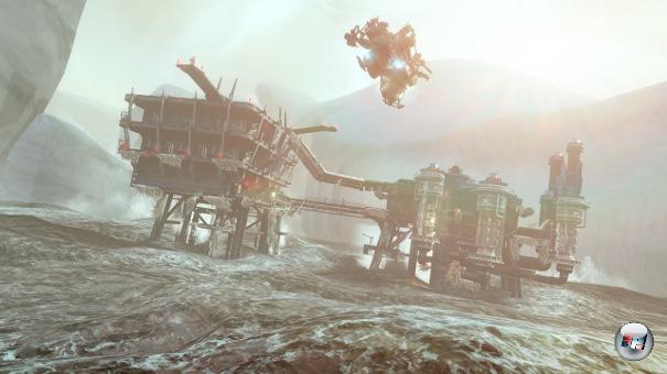 Soldaten mit virtuellem Wasserfetisch sollten schon mal die Fotoarchive frei machen und nah ran zoomen: Das nicht ganz zugefrorene Meer sieht einfach grandios aus, sorgt für eine fantastische, grau schwappende Brandung. Man fliegt in dieser Winterlandschaft in einer Jetpack-Rüstung von Eisscholle zu Eisscholle, während man gezielte Temposchübe setzen kann und plötzlich auftauchende Feinde in der Luft abwehren muss – Lost Planet 2 <a class="DYNLINK" onmouseover="DynToolTipp_Show('Klicken für Gameinfos‚)“ onmouseout=“DynToolTipp_Hide(); “ href=“javascript:DynCont_Display(‚Gamefinder‘,’runmod.php?sid=%7BSID%7D&LAYOUT=dyncont_gf&spielid=365083′)“> wirkt dagegen wie Schnee von gestern.