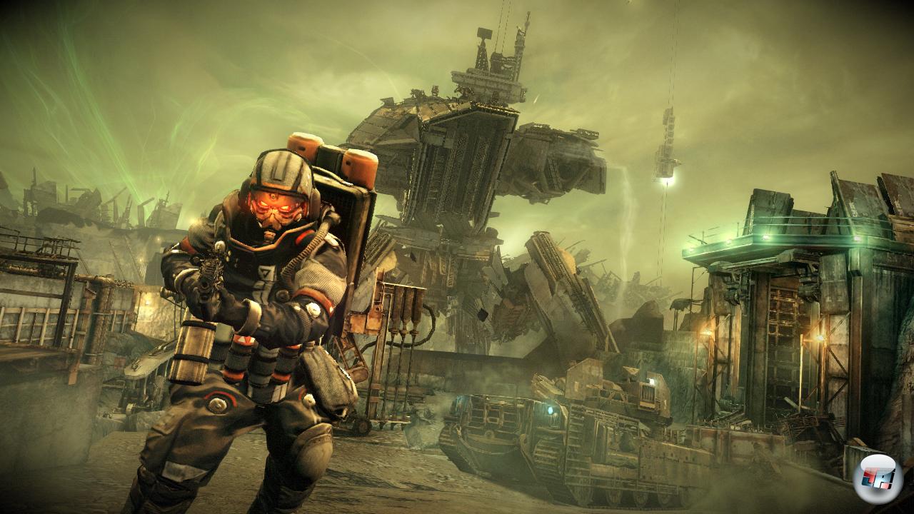 Da fällt mir ein: Pflanzen sich die Helghast eigentlich normal fort? Also, gibt es neben oben erwähnter noch Frauen auf Helghan? Davon oder von dem Rest der Bevölkerung der Feinde sieht man auch in diesem dritten Teil nichts, obwohl kurze Schwenks auf das zivile Leben gereicht hätten, um der Welt etwas mehr Leben zu verleihen. Gerade die Lücke von sechs Monaten hätte man nutzen können, um die Entwicklung auf dem feindlichen Planeten sowie die politischen Geschehnisse zu verdeutlichen. So bleibt es bei Schlachtfeldern, Müllhalden, Kratern, Dschungel und Fabriken. Und als Ersatz für mehr zivile gibt es immerhin mehr militärische Hintergründe. Und die sorgen für ein angenehm futuristisches, teilweise an die Hightech-Mech-Welt von Hideo Kojima erinnerndes und in seinen Weltraumsequenzen fast schon Richtung Star Wars tendierendes Flair.