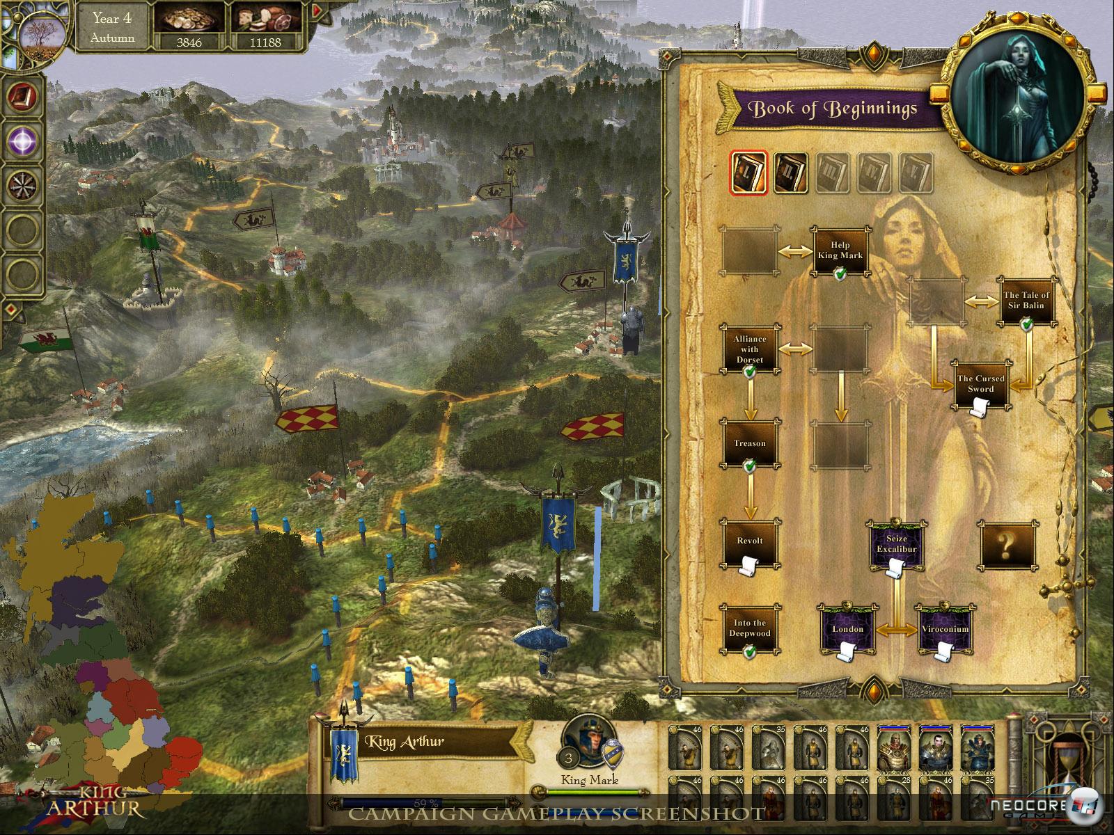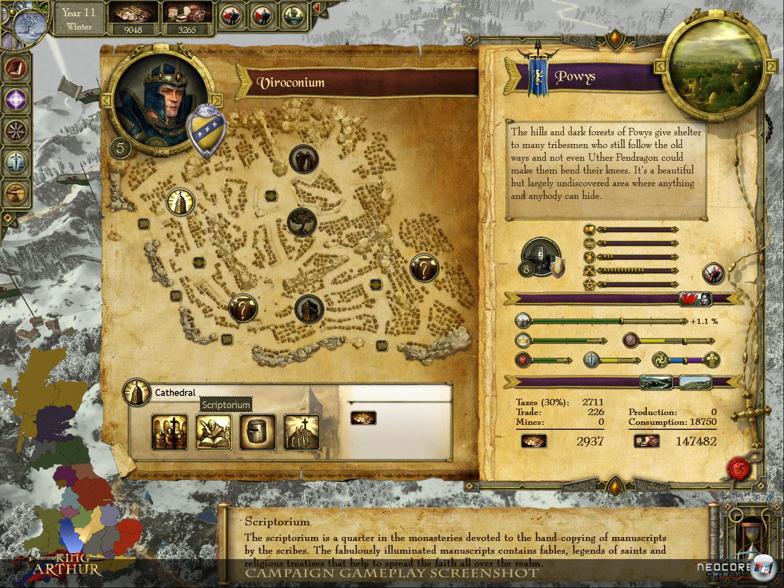 Von strategischem Interesse sind ebenfalls die Jahreszeiten (Runden): Im Frühling erscheinen meist neue Quests und gelegentlich finden Aufstände statt, falls die Nahrungsversorgung im Winter nicht akzeptabel war. Der Sommer als Zeit der Feldzüge belohnt die Armeen mit eineinhalbfachen Bewegungspunkten. Im Herbst wird sich auf den ankommenden Winter vorbereitet, denn in der kalten Jahreszeit können sich die Armeen nicht bewegen. Dafür dürft ihr im Winter und nur im Winter die erlangten Fertigkeitspunkte der Ritter/Helden und der einzelnen Truppen verteilen. Zugleich werden Steuern in den Provinzen kassiert und sobald ihr eine von drei Festungen errichtet habt, könnt ihr im Winter Gesetze sowie Erlasse festlegen (Privilegien für Lehnsherren, Steuern, etc.), die Festungen mit Gebäuden erweitern (Schmiede reduziert Rekrutierungskosten, Akademie erhöht Forschungspunkte, Kathedrale erhöht christlichen Glauben) und Forschung betreiben. Technologien sind in die Bereiche „Militär“, „Wirtschaft“ und „Königreich“ unterteilt und in verzeigten Technikbäumen zu erforschen. So werden aus Bogenschützen beispielsweise Langbogenschützen und später Meister- Langbogenschützen oder Armbrust-Schützen. Nicht zu vergessen: Ihr könnt Ritter der Tafelrunde als Lehnsherren zur Verwaltung der Provinzen einsetzen, wenn es ihnen an Loyalität/Motivation mangelt – wobei längst nicht jeder Ritter zum Regieren geeignet ist. Obendrein dürft ihr euch für eine Frau entscheiden und gefangene Helden im Kerker sterben oder verhören lassen.