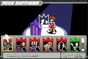 Das größte Problem von Chain of Memories sind die Wiederholungserscheinungen, denn im Grunde macht ihr die ganze Zeit dasselbe: Raum betreten, auf Gegner einhauen, um Kampf zu starten, ein knappes Dutzend Widersacher verprügeln, Karte kassieren, die benötigt wird, um eine bestimmte Tür zu öffnen – und das so lange, bis der Raum von allen Feinden befreit ist. Danach stapft ihr in den nächsten, wo das Spiel von vorn beginnt. Am Ende wartet dann der herausfordernde Endgegner-Kampf, bevor ihr vom zentralen Schloss des Vergessens aus in eine neue Welt wechselt – wo alles von vorn beginnt! Für ein Action-Adventure kommt außerdem das Adventure etwas zu kurz, denn Puzzles sind extrem rar gesät. Dafür seid ihr lange mit dem Spiel beschäftigt, das erste Durchspielen dürfte locker 15 Stunden dauern – und danach ist das Ganze noch lange nicht vorbei! Akustisch erwartet euch eine Mischung aus neuen Klängen, Final Fantasy-Stücken und bekannten Disney-Melodien, die zwar etwas synthetisch, aber nichtsdestotrotz angenehm klingen. Dazu gibt es abwechslungsreiche Soundeffekte und ein klitzekleines bisschen Sprachausgabe während der Renderfilme – im Spiel bleiben alle Akteure leider stumm.
