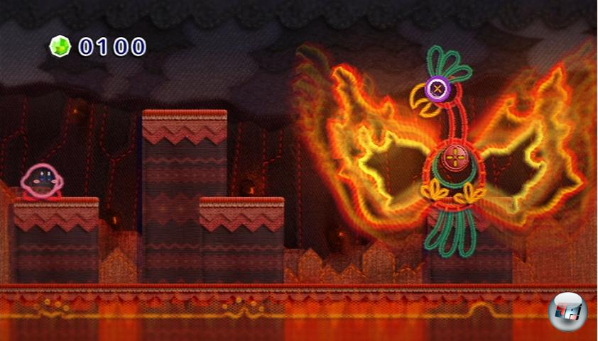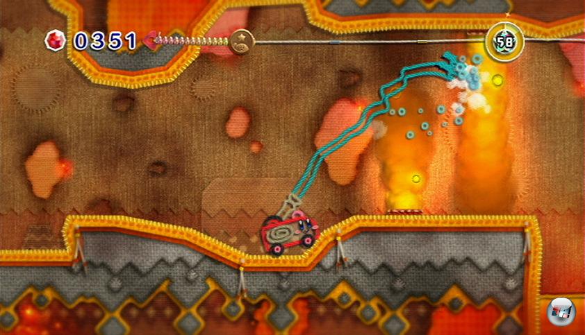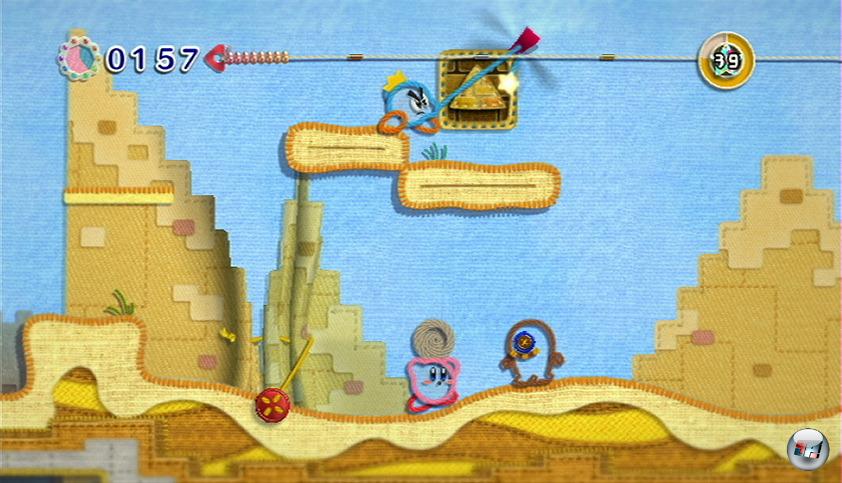 Aber »simpel« hat auch eine weitere Bedeutung – nämlich »leicht«. Im Falle von KEY wäre sogar »supersimpel« angebracht, denn das Spiel ist wirklich verdammt leicht. Sogar so leicht, dass es für Kirby unmöglich ist zu sterben: Wird er getroffen, verliert er nur einen Teil seiner gesammelten Edelsteine, ähnlich den Ringen bei Sonic. Doch während für den Stachelkopf danach die Zitterpartie beginnt, geht es für Kirby ganz normal weiter – es gibt keine Game Over-Möglichkeit, nur die Chance, am Levelende ohne Juwelen in der Abrechnung doof da zu stehen. Selbst die Bossgegner machen da keine Ausnahme: Egal ob schnappfreudiger Drache, Strickfeuer spuckender Stoff-Phönix oder erwähnter fieser Magier – ihre Angriffsmuster sind problemlos zu durchschauen, nach drei erfolgreichen Attacken ist in der Regel Schluss und Draufgehen auch hier unmöglich. Kurz gesagt: Die Kirby-Spiele waren schon immer sehr einfach, aber so leicht wie in Epic Yarn wurde einem das Leben noch nie gemacht. Noch einfacher wird’s, wenn ein zweiter Spieler einsteigt: Jeden Level darf man (nur lokal) gemeinsam angehen, Controller #2 übernimmt dann die Rolle des blauen Prinzen Fluff, dem die gleichen Möglichkeiten zur Verfügung stehen wie Kirby. Teilweise schlüpft man sogar gemeinsam in eine Haut – so kontrolliert der eine die Bewegungen des Panzers, während der andere feuert. Apropos Controller: KEY wird ausschließlich mit der Wiimote gesteuert, welche die meiste Zeit über quer gehalten wird. Nur in Ausnahmefällen (wie der Einrichtung des Zimmers oder der unnötig fummeligen Kontrolle der Kirby-Lokomotive)